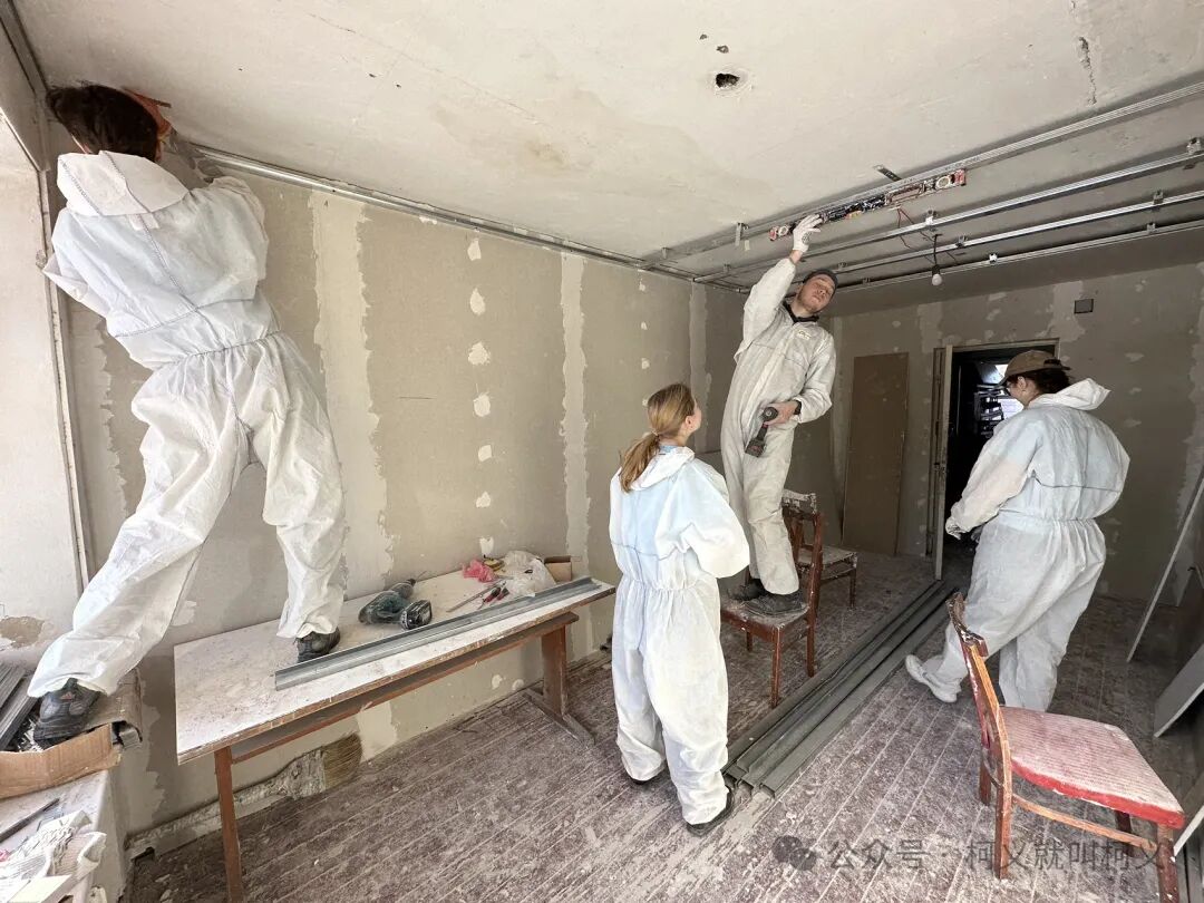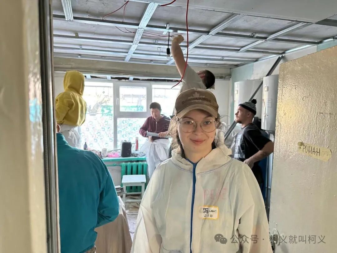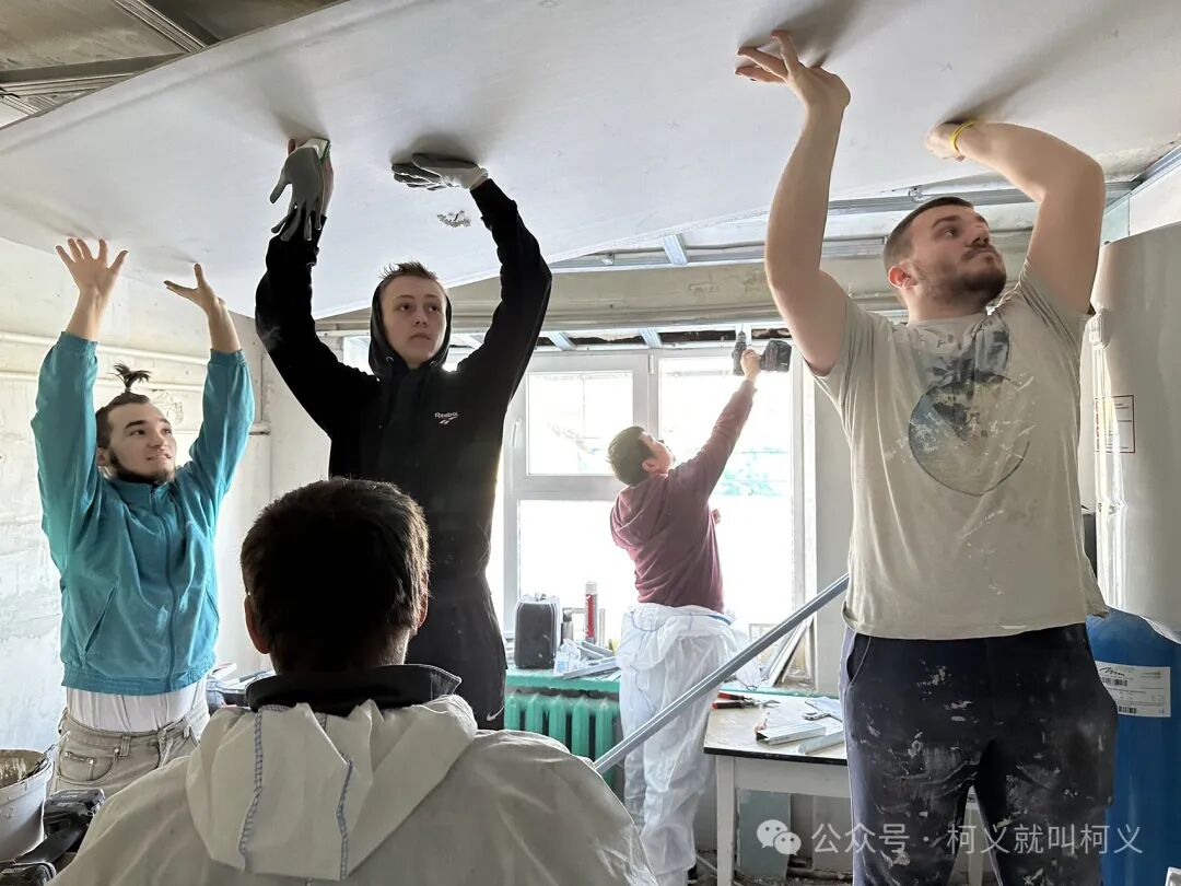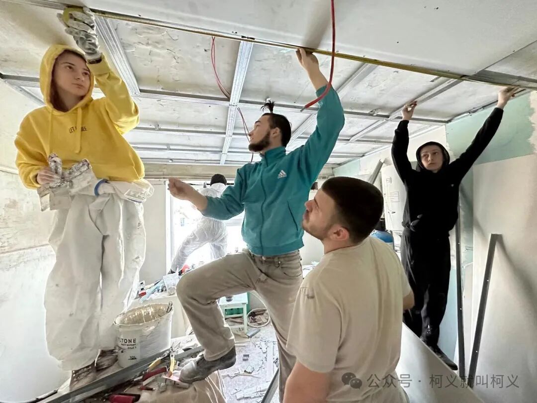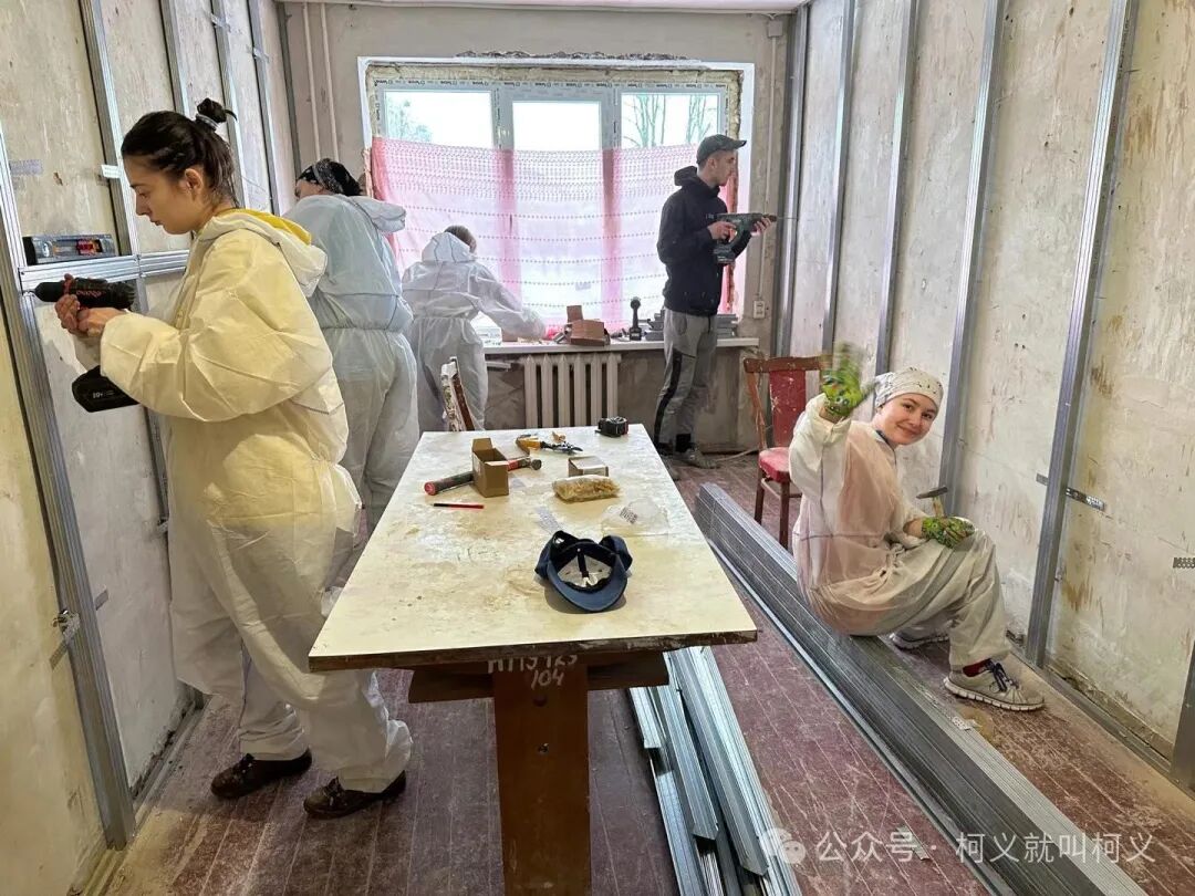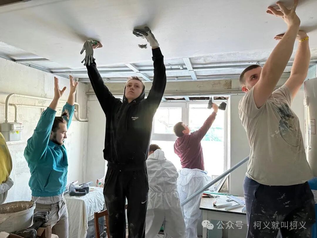 我自己很少有机会可以做一些有电具的活,所以和他们在一起我挺开心的,可以真正的使用电钻,跟他们学习使用这些常用工具说实话对我来说受益匪浅,我发现乌克兰的女孩子一点都不矫情,无论是和浆泥还是涮墙壁都没有叫累叫脏,有一个穿黄色外套的女孩,我对她的印象特别的深刻,因为她偶尔会找我聊天,从交谈中我得知她和全家是从马里乌波尔逃难过来的,已经安定在了基辅市,她是大二的学生,估计需要转学校,她告诉我她的家已经被俄罗斯军队的占领了,被他们住上了,其实每次聊到这个话题我都不知道该怎么深入下去,对他们来说这些回忆的痛不是一丁点的痛了而是深深的伤疤,所以我只能再转换话题,尽量让气氛正常一些。