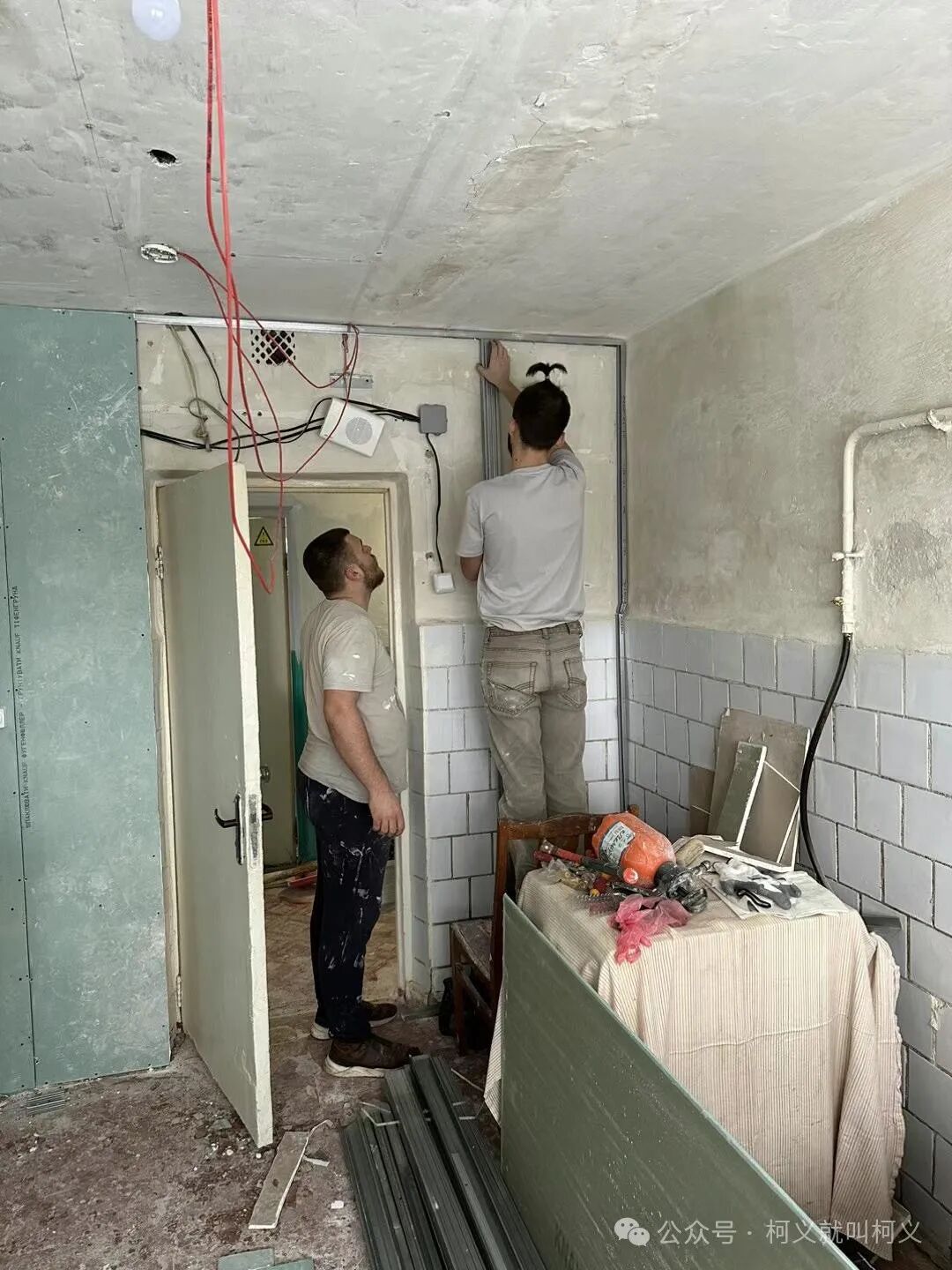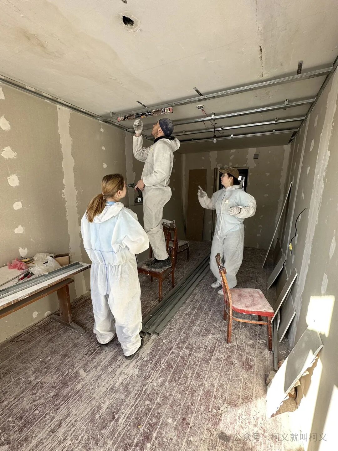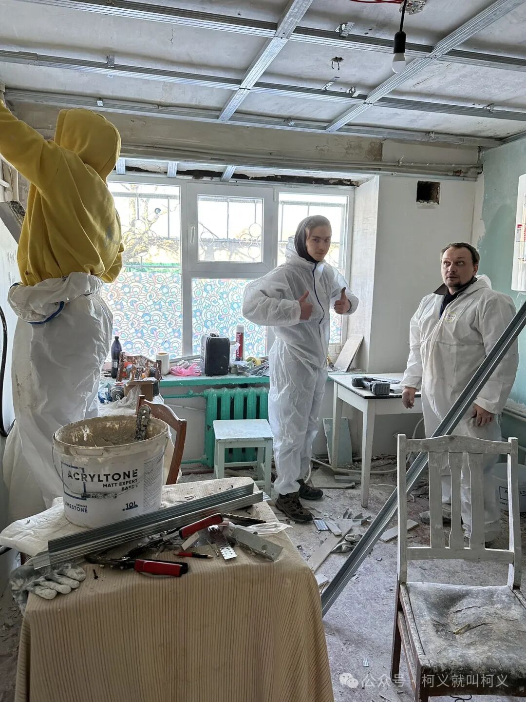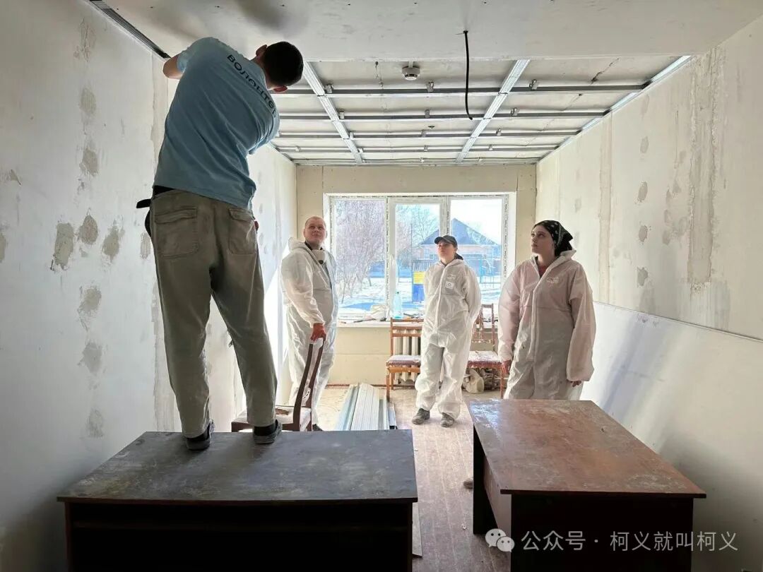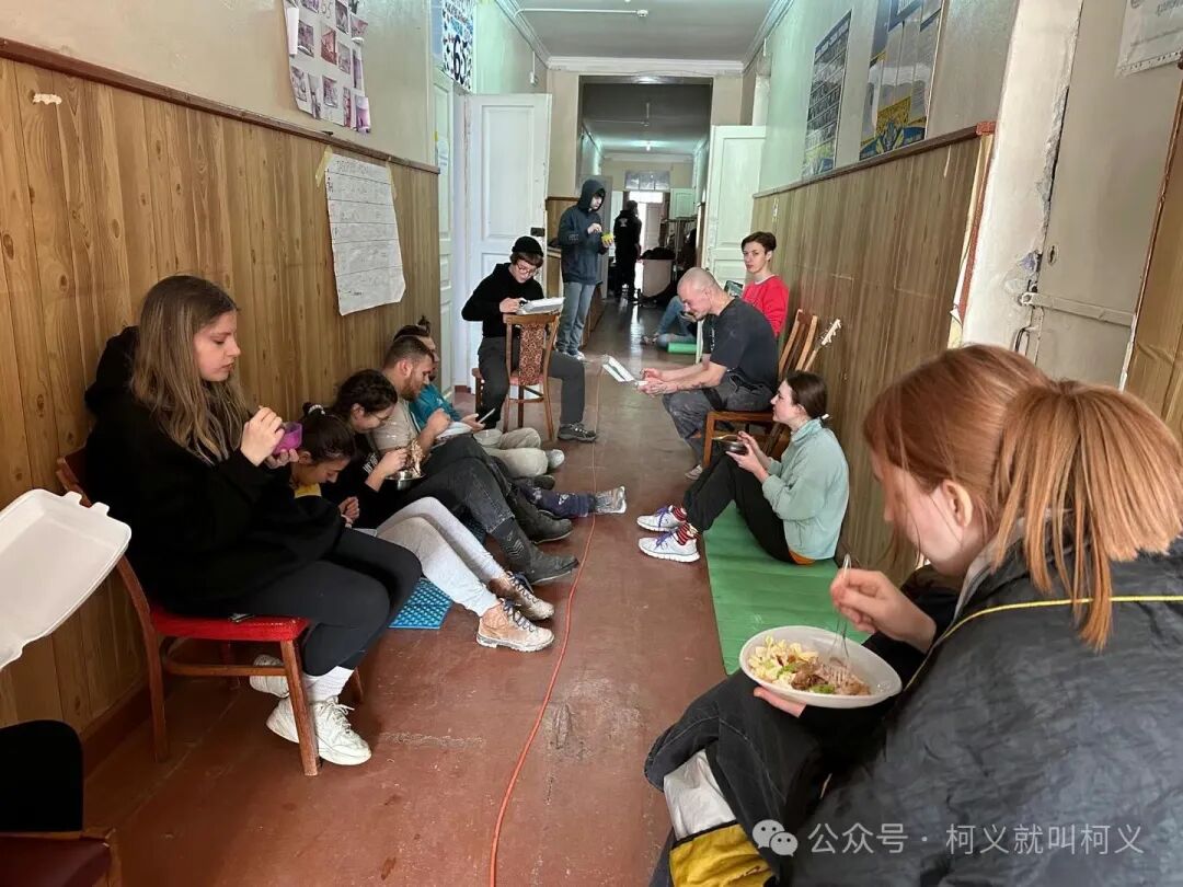 我自己很少有机会可以做一些有电具的活,所以和他们在一起我挺开心的,可以真正的使用电钻,跟他们学习使用这些常用工具说实话对我来说受益匪浅,我发现乌克兰的女孩子一点都不矫情,无论是和浆泥还是涮墙壁都没有叫累叫脏,有一个穿黄色外套的女孩,我对她的印象特别的深刻,因为她偶尔会找我聊天,从交谈中我得知她和全家是从马里乌波尔逃难过来的,已经安定在了基辅市,她是大二的学生,估计需要转学校,她告诉我她的家已经被俄罗斯军队的占领了,被他们住上了,其实每次聊到这个话题我都不知道该怎么深入下去,对他们来说这些回忆的痛不是一丁点的痛了而是深深的伤疤,所以我只能再转换话题,尽量让气氛正常一些。