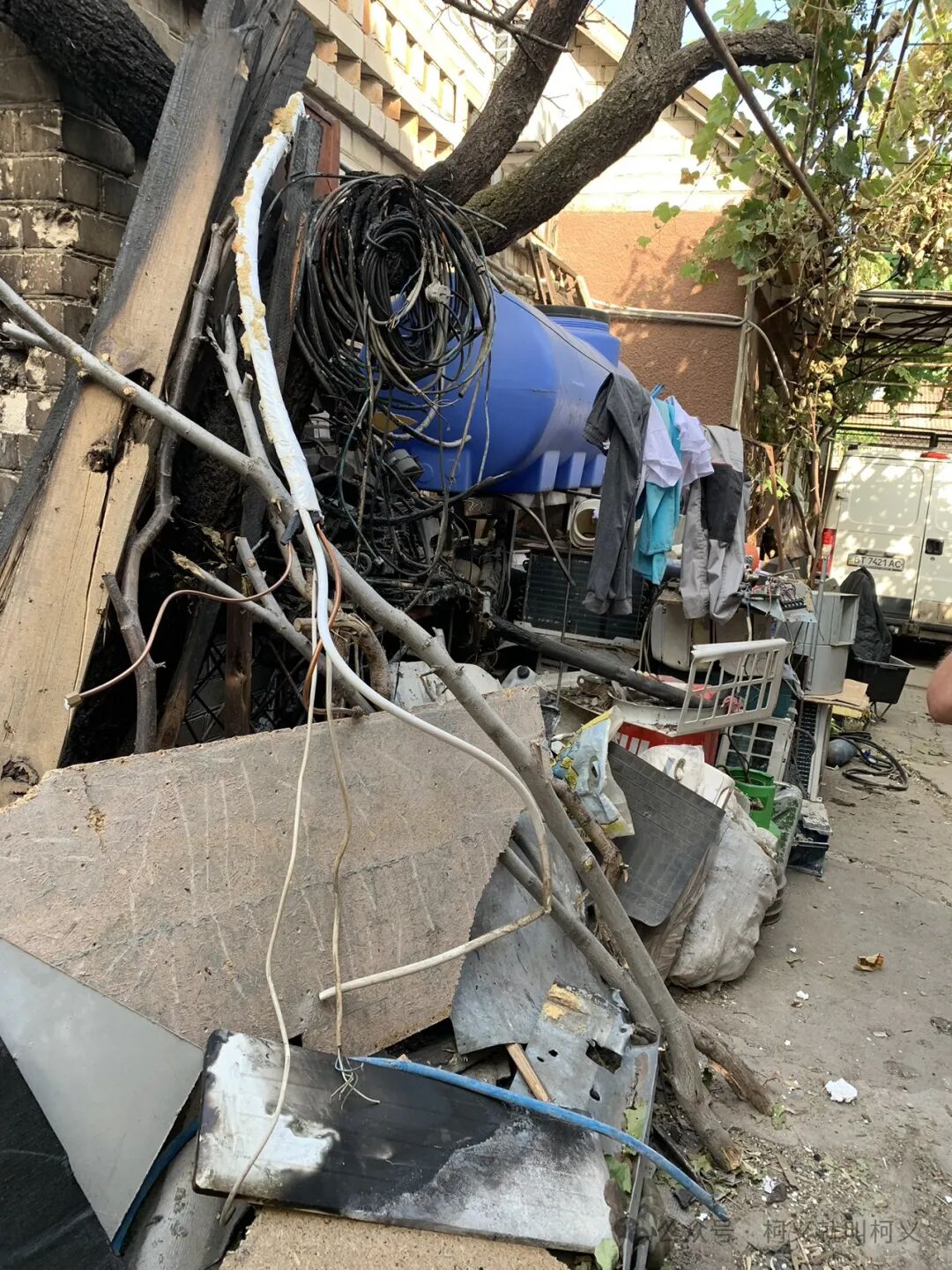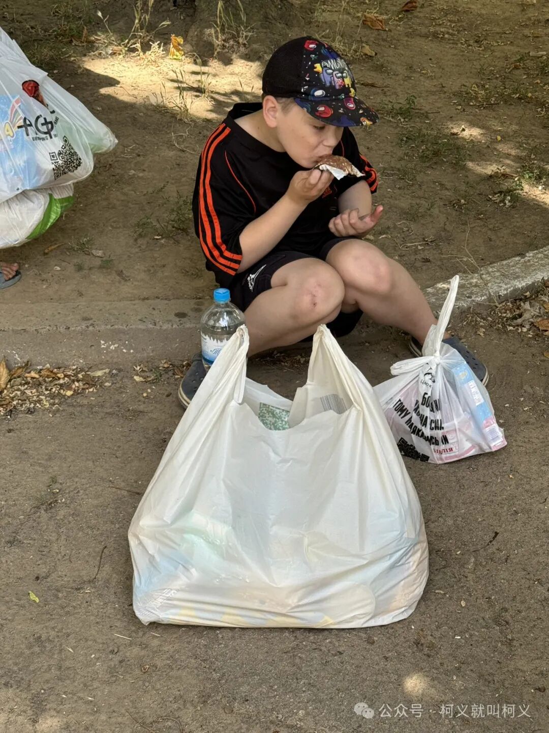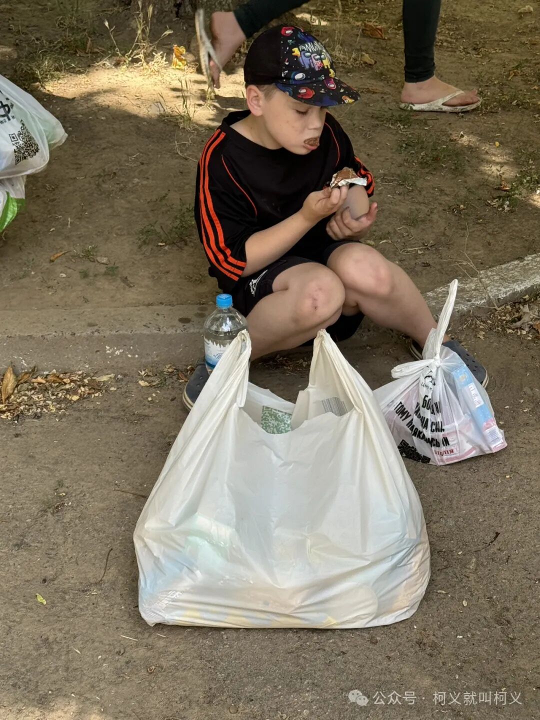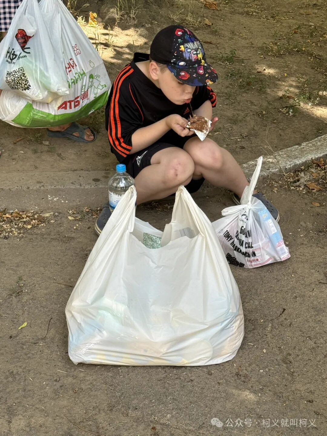 他撅着嘴旁若无人的津津有味地吃起巧克力来,长长的糖丝还挂在他嘴上,我们刚发完食物袋,他就迫不及待地拿起巧克力坐在地上吃起来,我拍下了这一瞬间,起初还觉得挺好笑的,看着他舔着因为气温高融化粘在纸袋上的巧克力,内心里不禁的泛起一阵心酸😔,不知道他有多久没有吃到巧克,我拿起多余的巧克力给他,他笑着大大方方地伸手接过,没有害羞也没有觉得不好意思,朝我说了一声谢谢,我很喜欢他的率真。这是在赫尔松市右岸离俄罗斯军队控制的左岸地区仅有2公里的一个小区,我是第一次来到这里,完全想象不到还有这样一个地方。条件要比我之前探访的过的家庭要差很多,虽然这边离赫尔松市区没有多远,但是没有顺路的公交车,而且此处因为靠近前线太过危险,还有军事安全问题在旁边设立了一个检查站(基本上军队的人参与管理)。