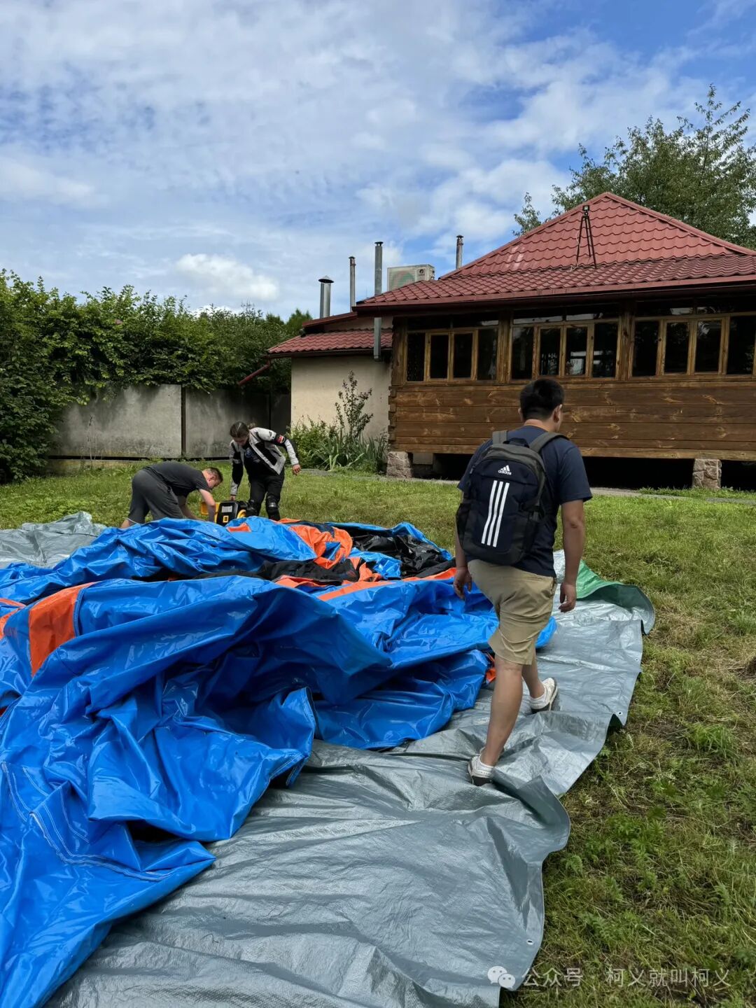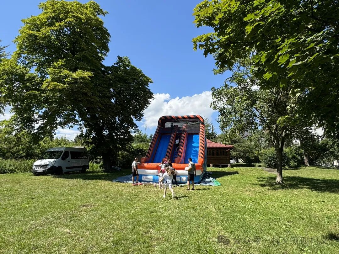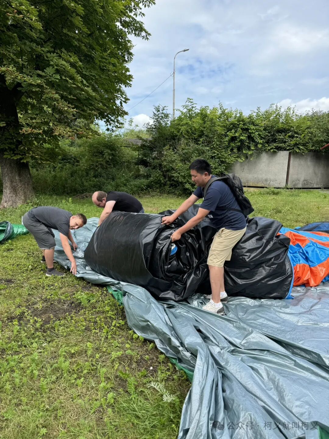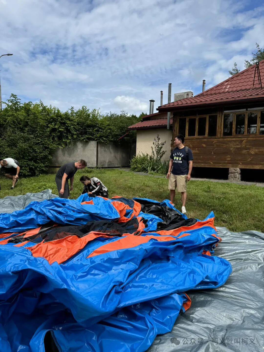 利沃夫安置点的朋友最近特别忙,他们在忙儿童夏令营活动的事情,在七月和八月乌克兰很多城市都会举办儿童营会,这个时间段刚好是暑假,这周日会有20个伊久姆那边的青少年来到利沃夫参加青少年的营会。我刚到安置点(也是教会),他们就已经开始了,Roman在不远处和其他几个青少年在搬运充气帐篷,人手不够,我赶着过去帮忙,今天是星期五,大家都去上班了,也就只有青少年还可以过来帮帮忙,Mark特意开着他的爱玛电动自行车过来看我们,顺便帮一下,我猜测他是送外卖顺路经过的,没过多久他就离开了,去接单干活了。