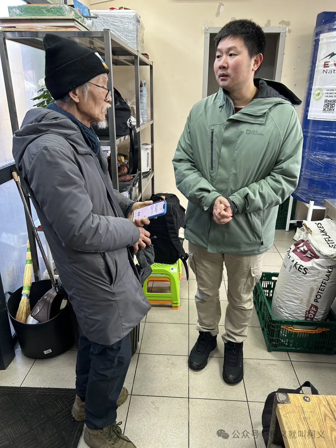因为日本记者Eiji的缘故,我想今天来哈尔科夫可以来拜访一下他,说实话我对拜访陌生人没有太多经验,刘毅强老师帮了我不少,我们说明了来意,他很热情的和我们合影,然后我们开始了一些交谈,他以为我是记者,带我去到了厨房,我们在厨房里参观了一下,一共有四个不同的储藏室,有儿童的,老人的,食物和工具,儿童的场地是每周六开放给所有儿童可以领取礼物,老人的物资是每个月发一次。