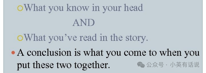作者并不总是告诉你一切。他们可能会告诉你故事中发生的事情或人物的一些细节。你可以利用这些细节和你所知道的来得出结论(Draw conclusions)。