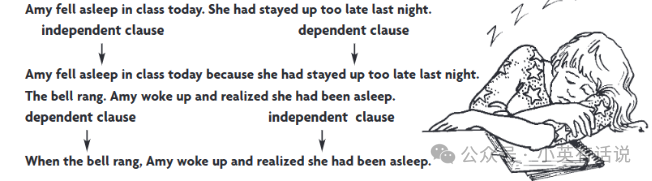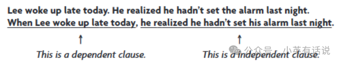 (PS:The term dependent clause is simply another name for subordinate clause. 从句(dependent clause)一词是用来与独立分句(independent clause)相对比的,独立分句就是不需要任何附加成分就能构成一个完整句子的分句。)