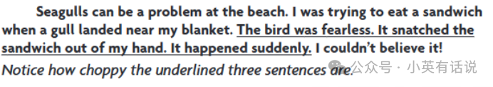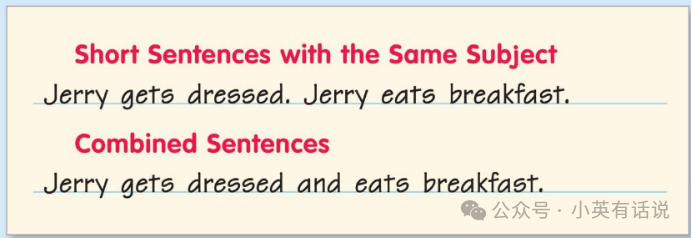 你有没有注意到,短句会让你的文章听起来很不流畅?当两个或两个以上句子的主语相同,但谓语不同时,可以用 “和”(and),或“但是”(but),把它们合并成一个句子。