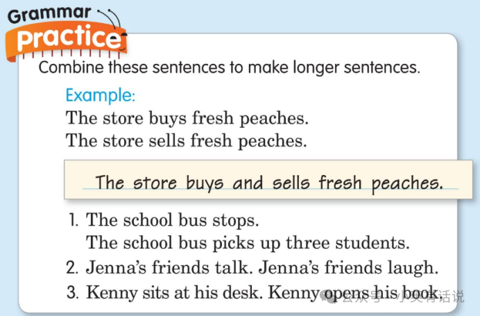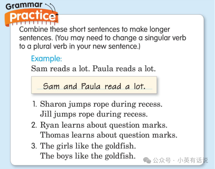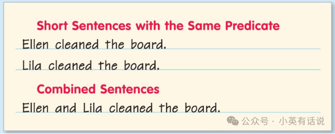 还可以将谓语相同的短句组合在一起。当两个或两个以上句子的主语不同,使用同一个谓语时,可以将它们合并成一个复合主语的句子。。可以使用连词 and、but 和 or 来组合句子的各个部分。如果主语是复数,则将动词形式从单数改为复数。