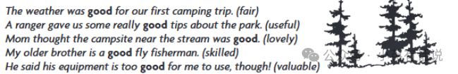 现在重读这些句子。这次用括号中的词代替 “好”。您可以使用类属词典(thesaurus)来帮助找词。类属词典是一本提供单词同义词(synonyms)和反义词(antonyms)的参考书。