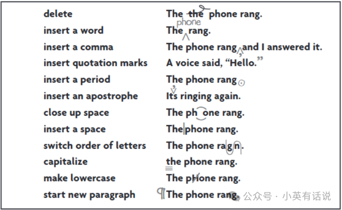 校对习作时,需要查找错误并做标记,以便改正。以下是在校对作品时可以使用的一些标记。