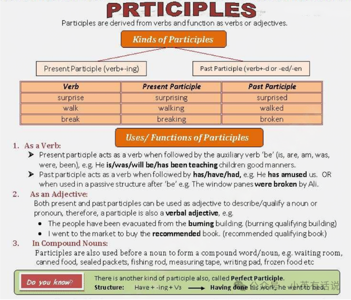 英语中的分词(Participle)是动词的非限定形式(non-finite form),可用作动词(verb),也可用作形容词(adjective)或副词(adverb)。