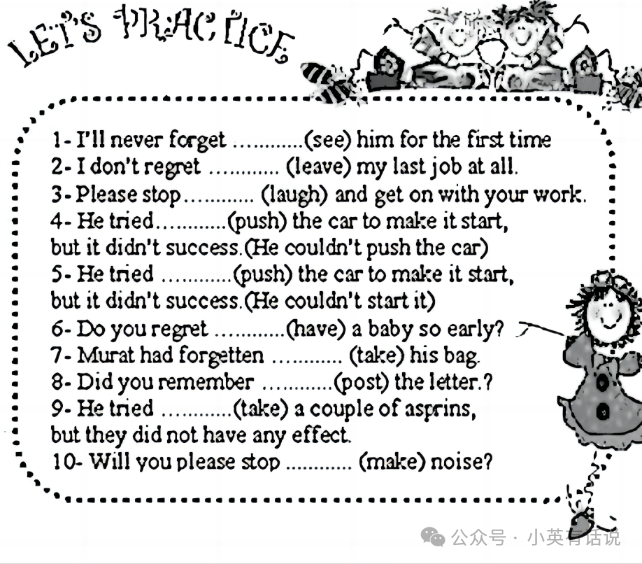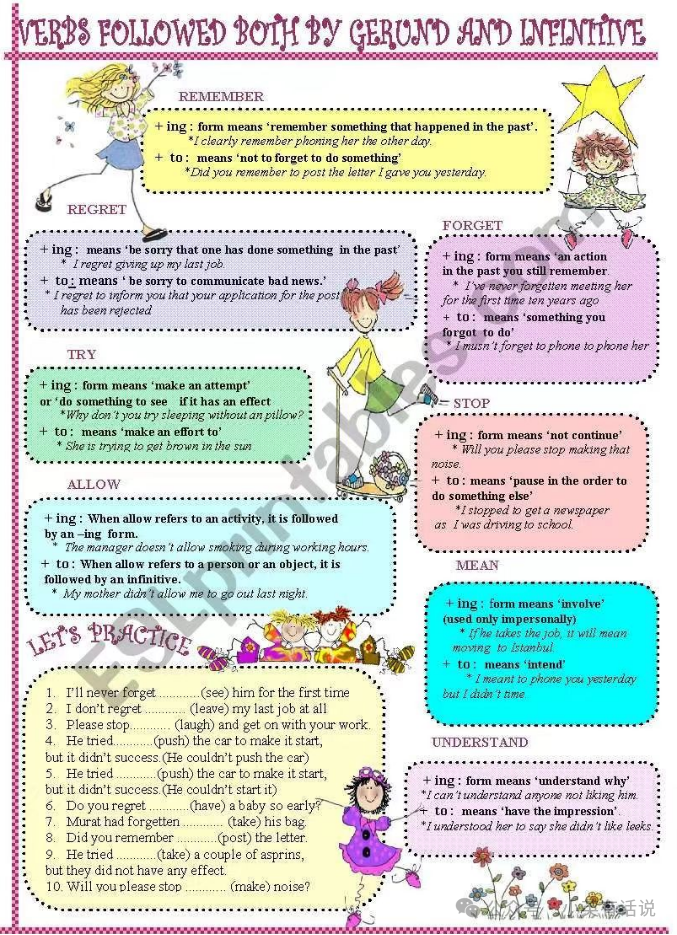 在英语学习中,动词不定式(infinitive)和动名词(gerund)是两种常见的非谓语动词形式,它们在相似的固定搭配上有时很容易引起混淆。以下是一些常见的动词不定式和动名词搭配用法,请务必注意区分它们的使用。