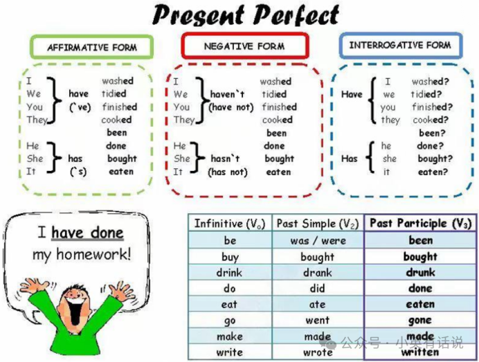 现在完成时是英语语法中的一个时态,用于描述过去发生的行为对现在产生的影响或结果。其基本结构为:主语+have/has(助动词)+动词的过去分词。以下是它的常见用法: