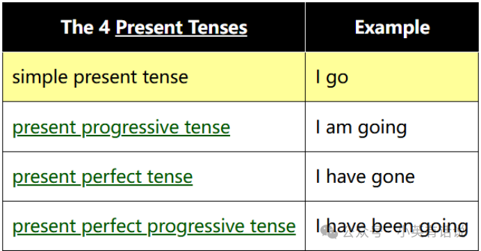 一般现在时是四种现在时态之一。四种现在时态分别是:一般现在时,现在进行时,现在完成时,现在完成进行时。请注意动词的变形,详情请看我的前文“时态的构成”。