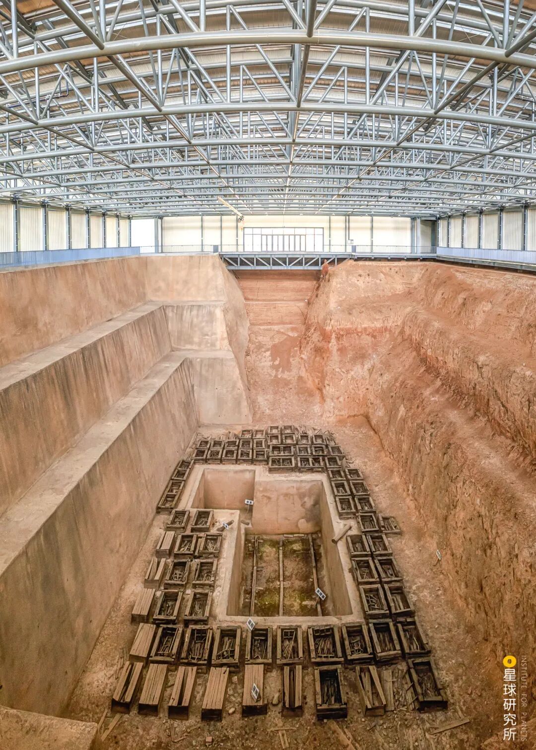 (下图为秦公一号大墓,墓主为春秋时期的秦国国君景公,一个个箱子或匣子装殓殉人,计166人,另有20人无葬具埋在土中,共计殉葬186人,摄影师@李文博)