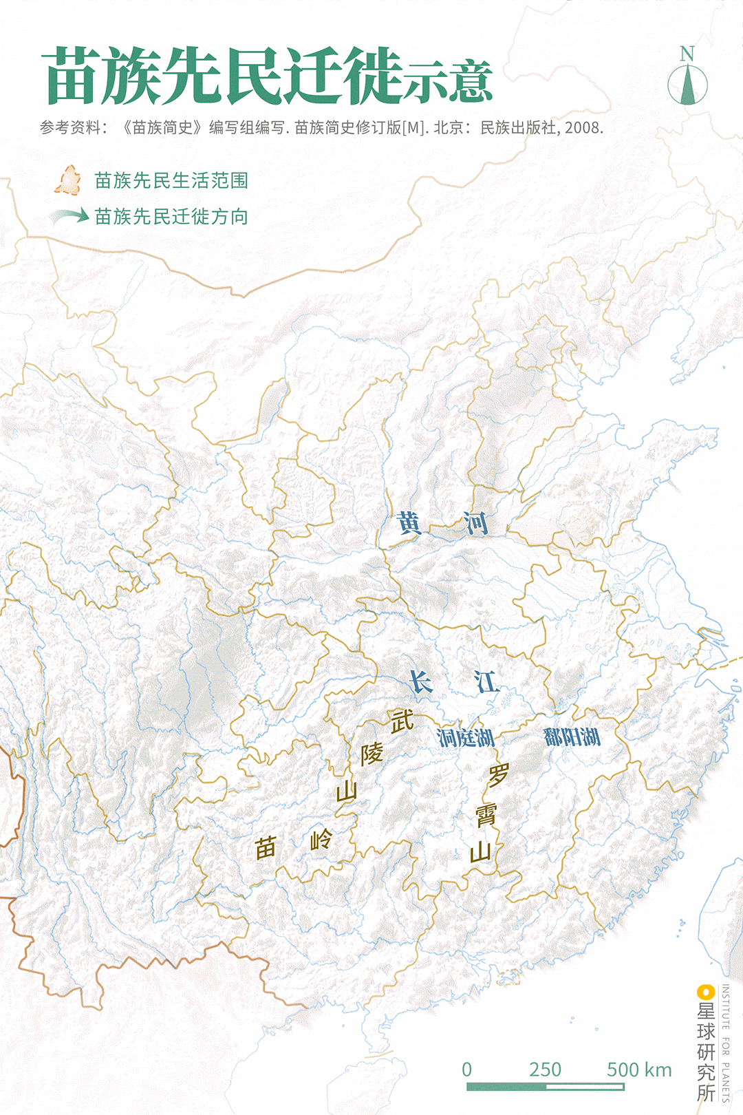 (苗族祖源、迁徙路线尚有学术争议,本文参照当前学界主要观点。下图为苗族先民迁徙示意,制图@