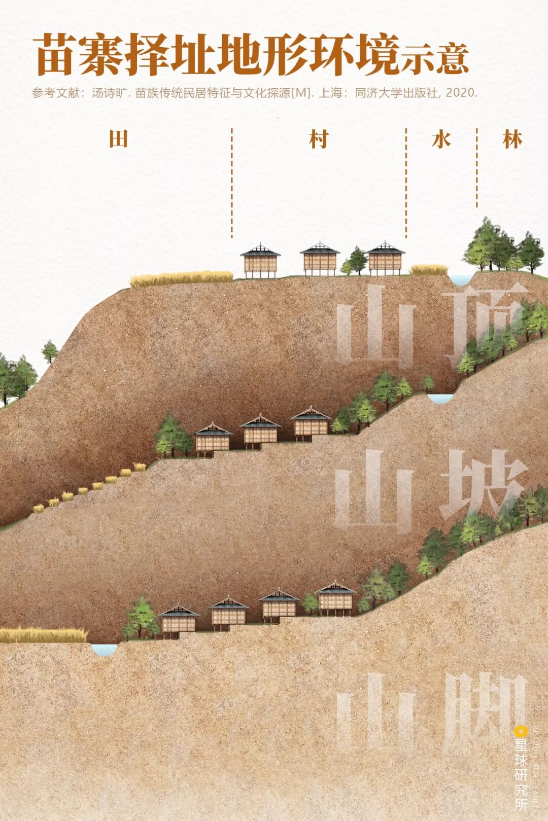 (苗寨择址地形环境示意,湘西地区三者兼有,黔东南地区多建寨于田亩上方的山腰或山顶,制图@杜睿/星球研究所)