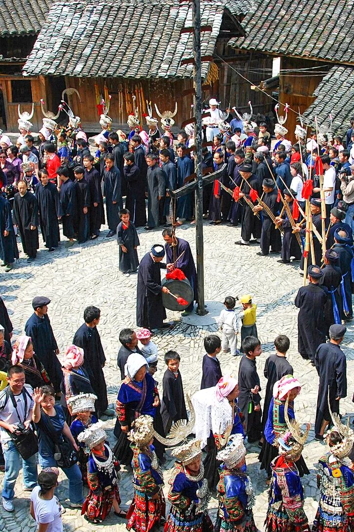 (贵州郎德上寨节日时悬于铜鼓坪中心的铜鼓,摄影师@老J)
