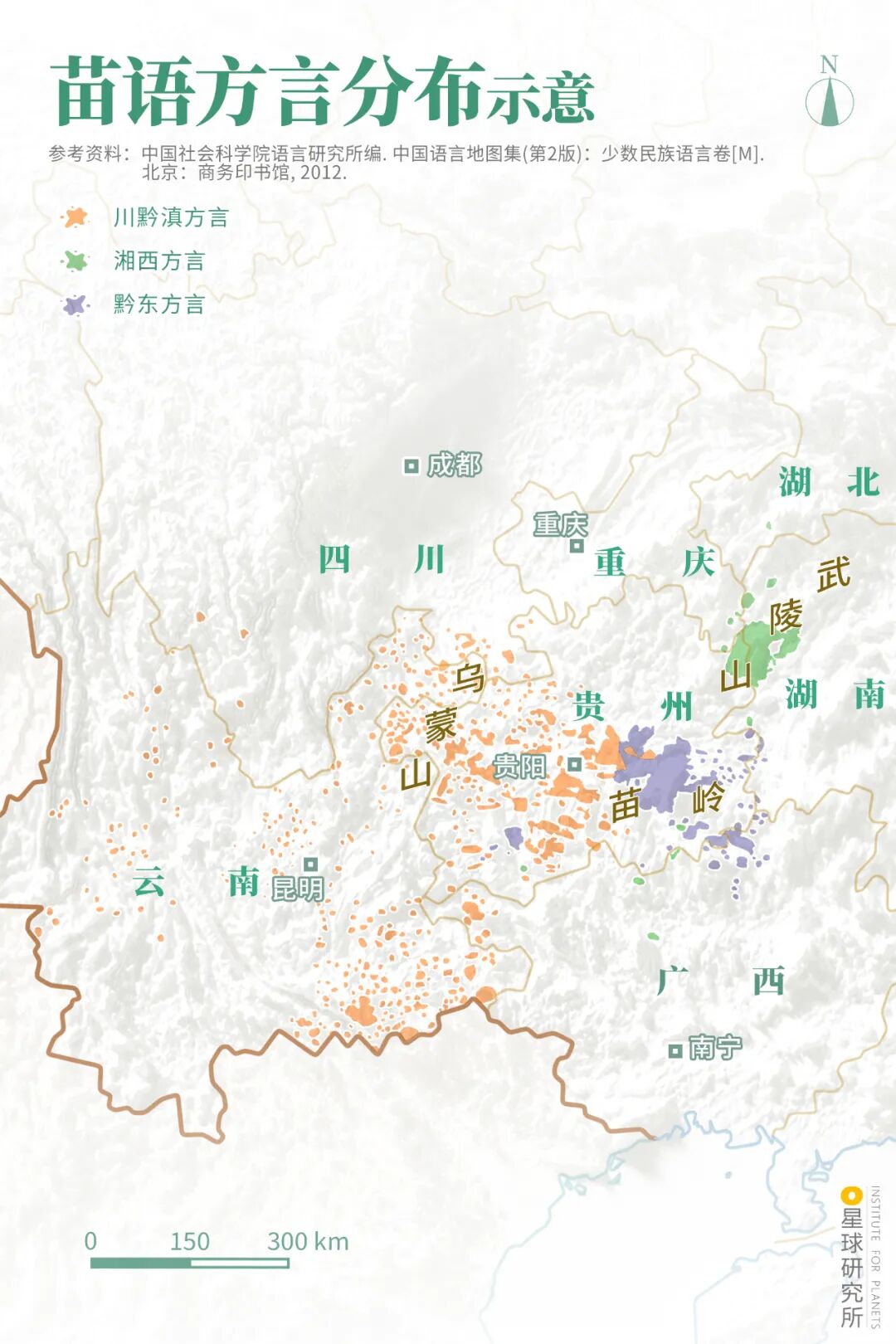 苗语方言分布示意,绝大部分苗族人以苗语为母语,此外还有部分使用汉语、侗语和瑶语