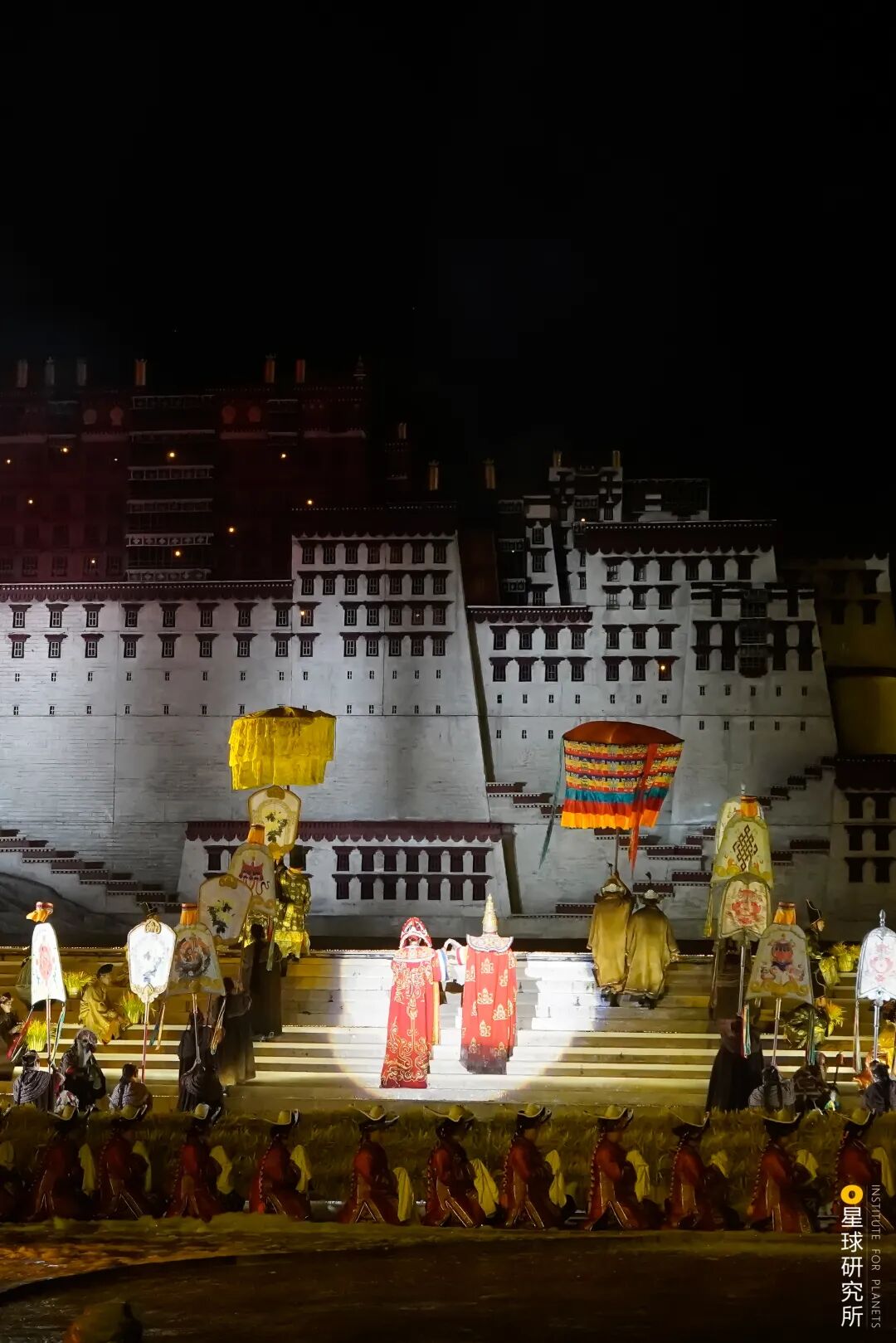 (《文成公主》演出中的红山宫,红山宫是布达拉宫的前身与基础,该宫殿在藏文古籍《柱间史》《王统世系明鉴》中均有详细记载,摄影师@李贞泰)