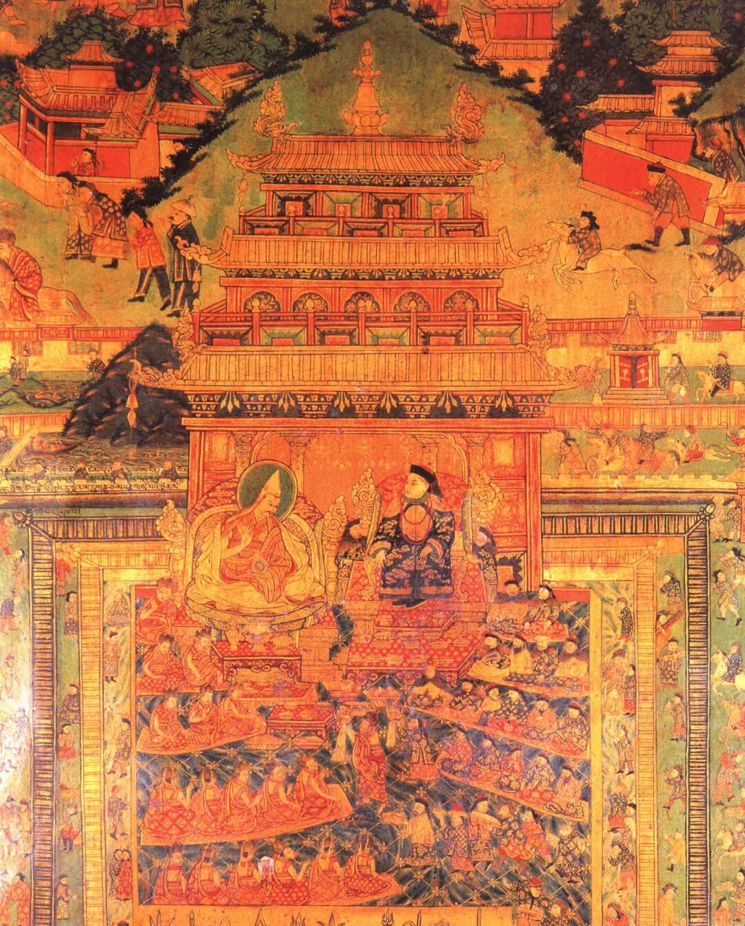 (描绘五世达赖朝觐顺治皇帝的壁画,五世达赖喇嘛被清朝廷正式册封为“西天大善自在佛所领天下释教普通瓦赤喇怛喇达赖喇嘛”,由此达赖喇嘛在西藏的佛教领袖地位正式固定下来,图片来源@wikimedia commons)