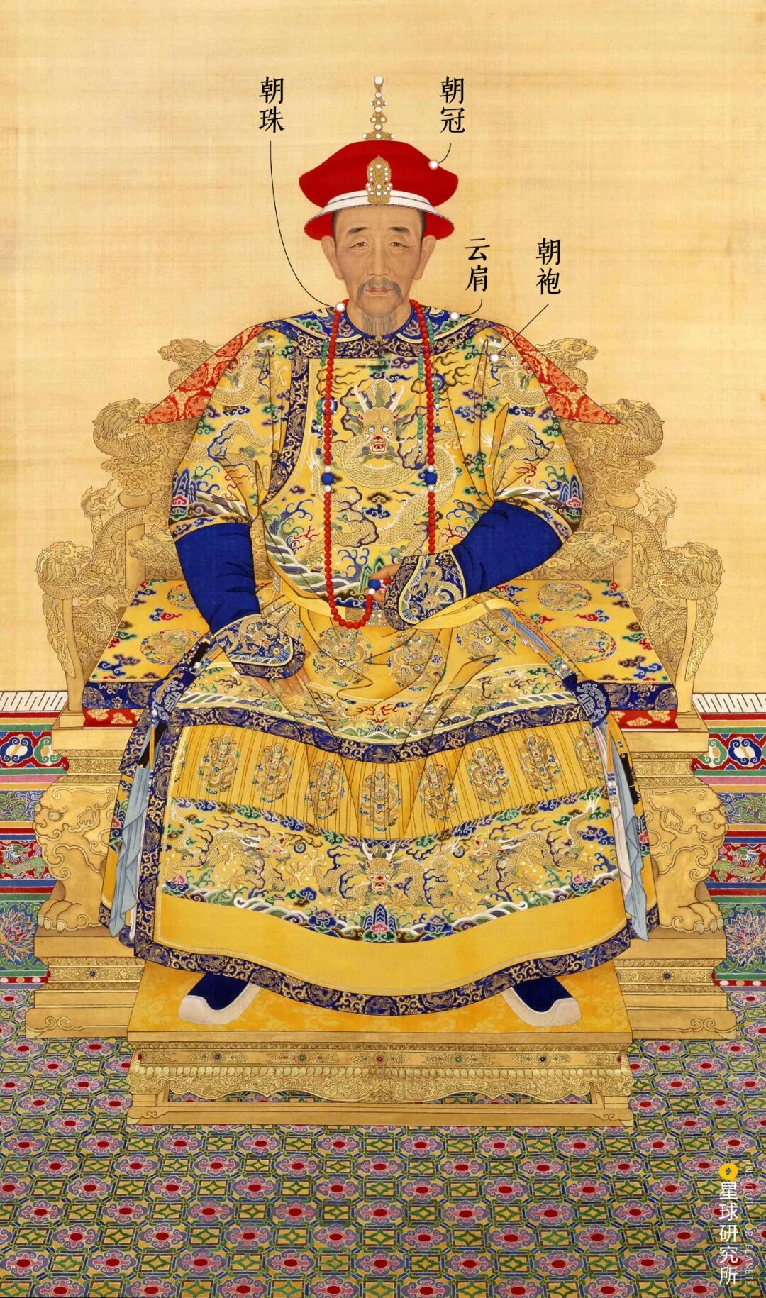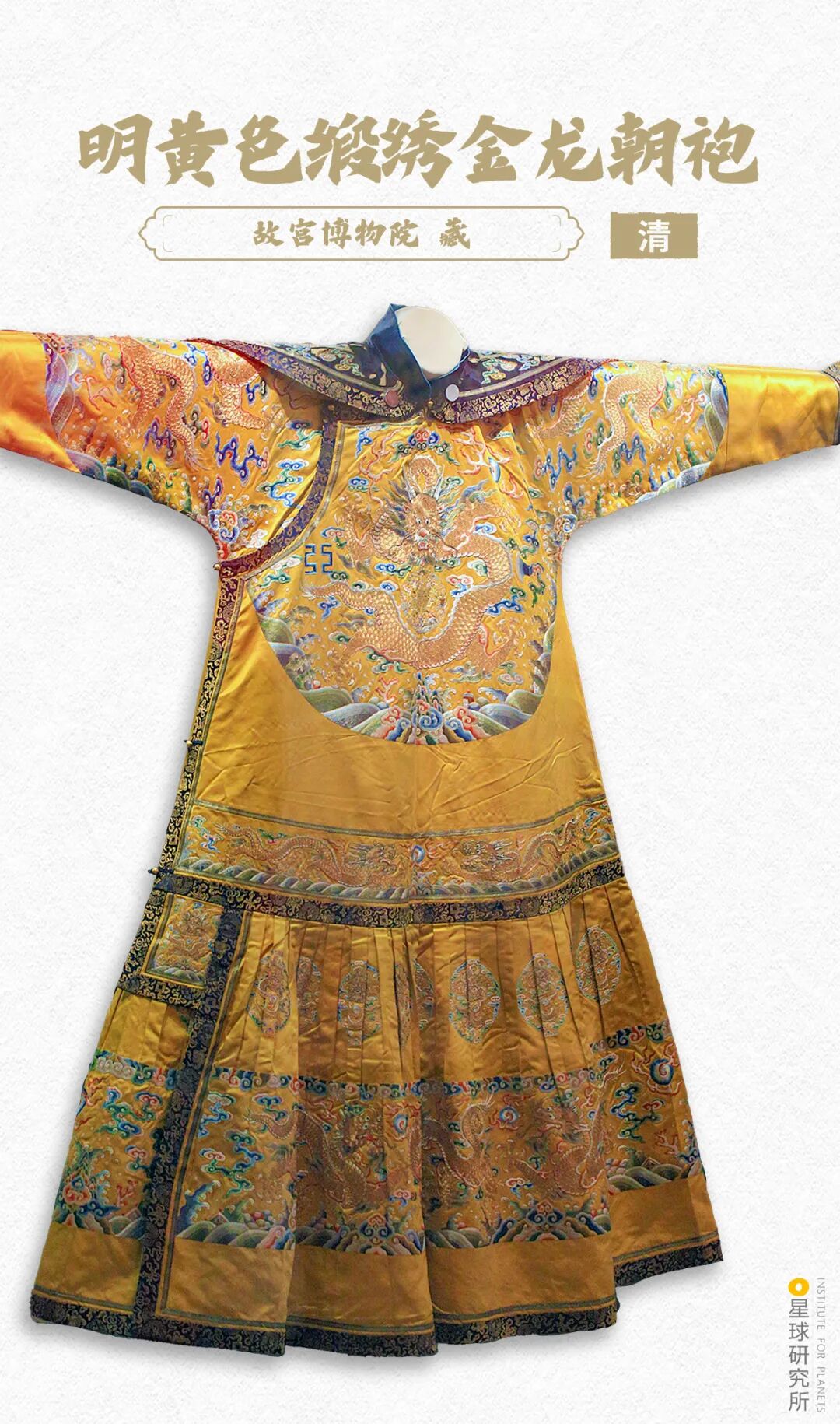 (明黄色缎绣金龙朝袍,请滑动查看清康熙皇帝画像,图片来源@动脉影&Wikimedia Commons,制图@王申雯/星球研究所)