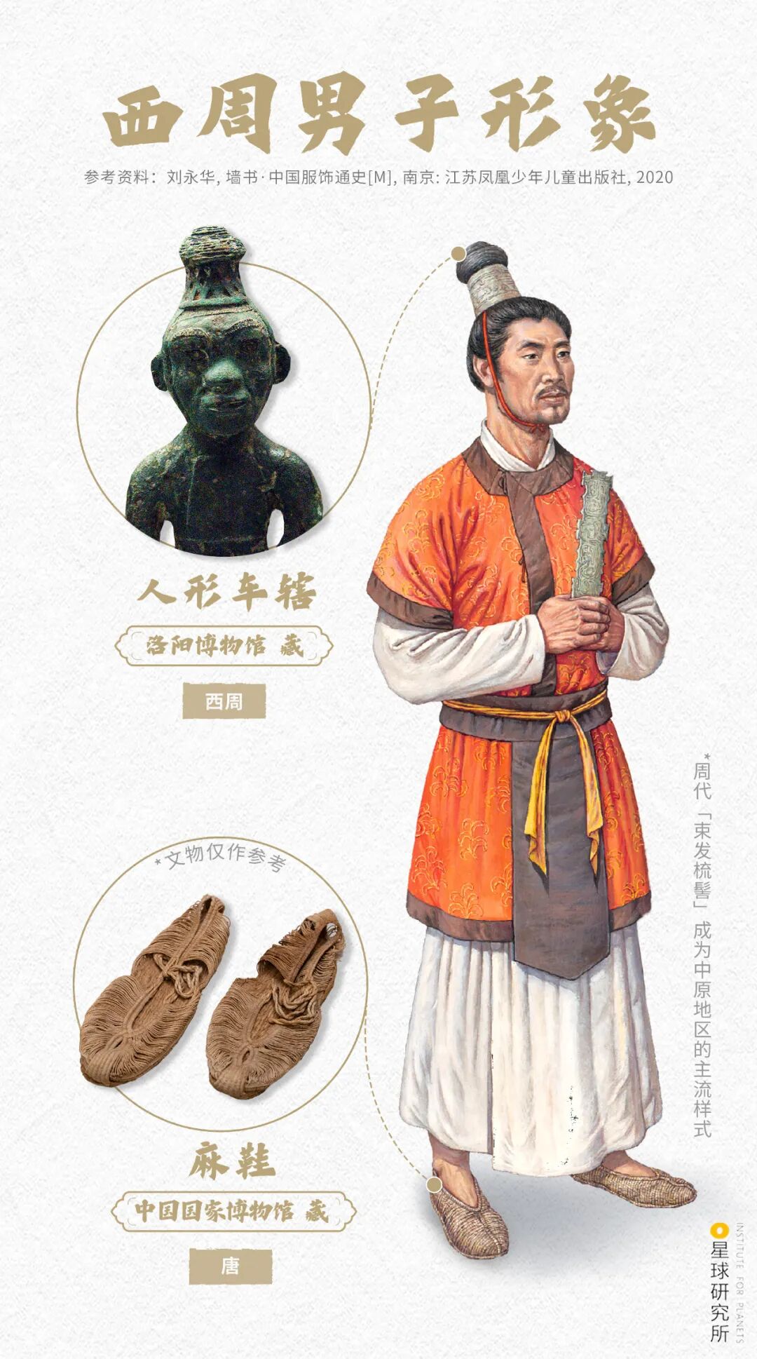 (据汉《礼记》记载“周人尚赤”,此说法或并不可靠;下图是西周男子形象示意,绘画@刘永华,摄影师@雾雨川&柳叶氘,制图@王申雯/星球研究所)