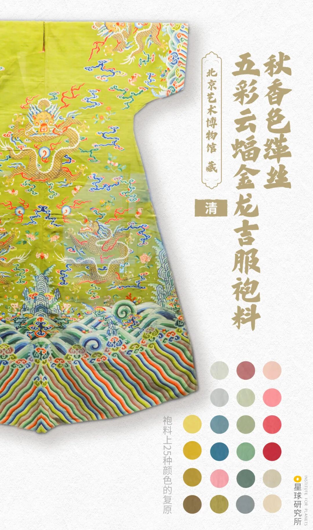 (秋香色缂丝五彩云蝠金龙吉服袍料,摄影师@动脉影,制图@王申雯/星球研究所)