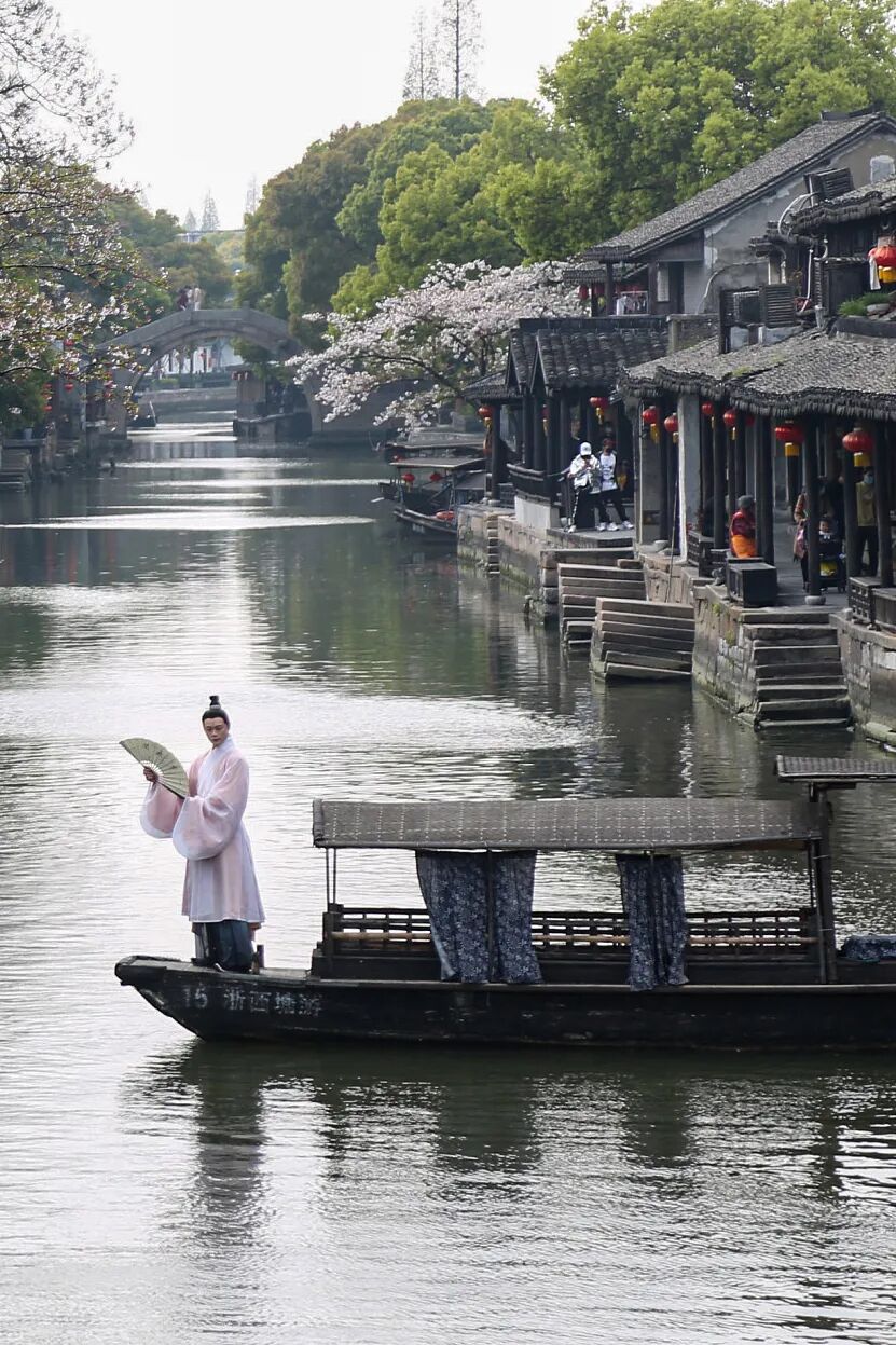(2020年4月,浙江嘉兴西塘古镇景区里的游客身着古装乘游船赏樱,图片来源@视觉中国)