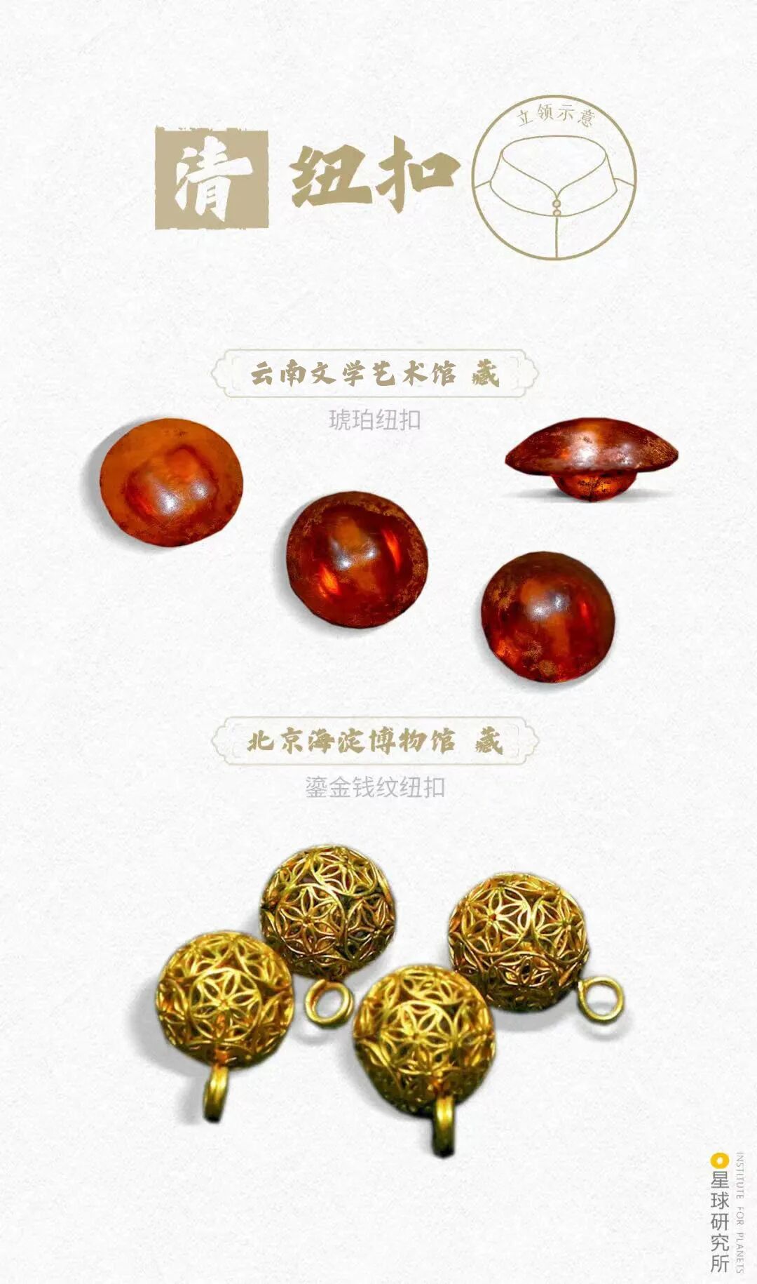 (贵族多采用金银以及翡翠等宝石制成的扣子;下图是清代出土纽扣,摄影师@路客看见&动脉影,制图@王申雯&汉青/星球研究所)