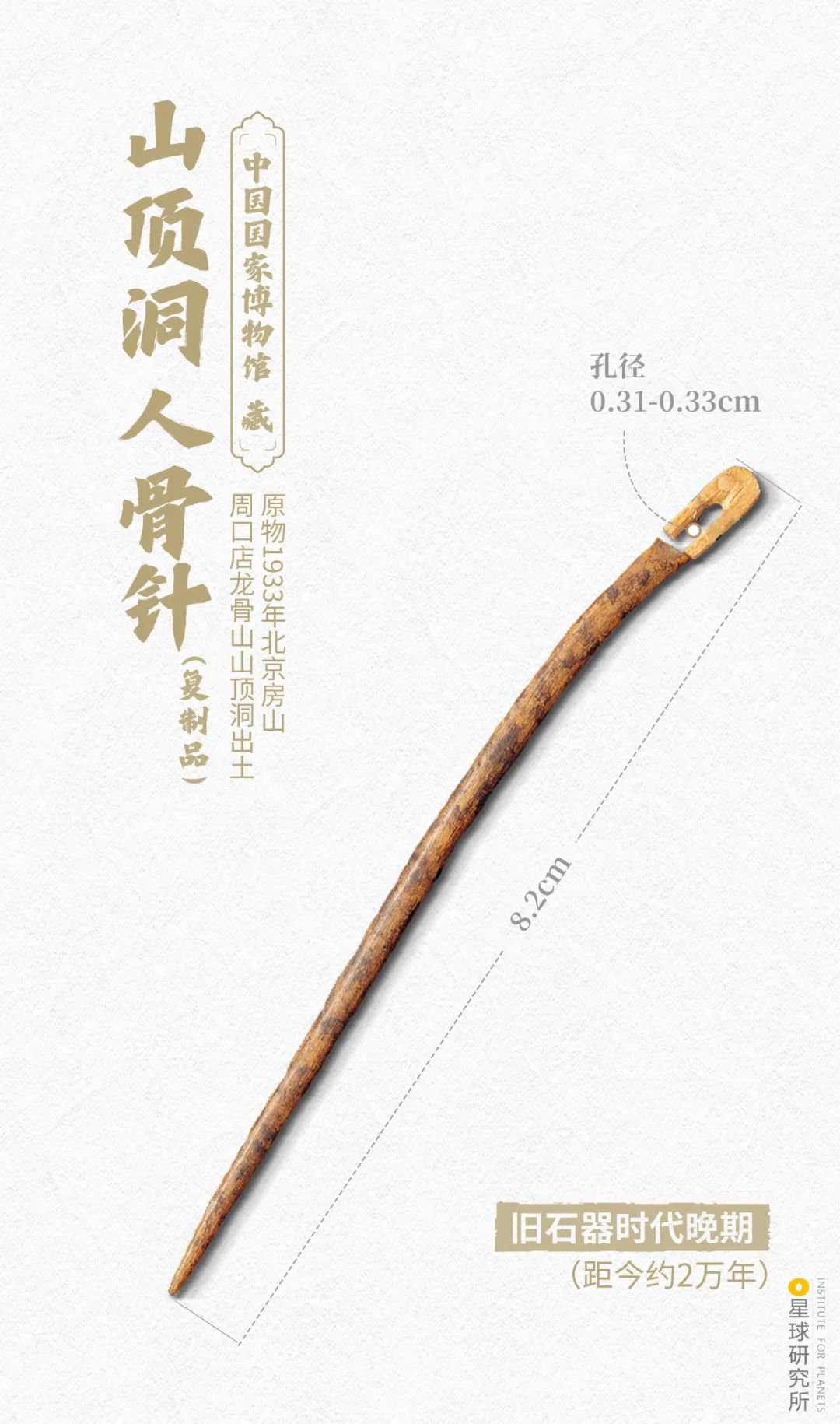 (北京周口店遗址出土的旧石器时期骨针,只有几毫米的针眼代表当时钻孔技术已达到相当水平,图片来源@中国国家博物馆,制图@王申雯/星球研究所)