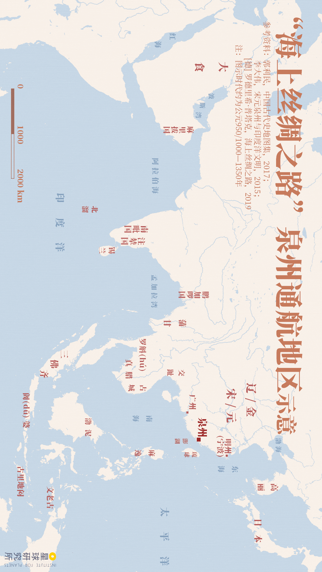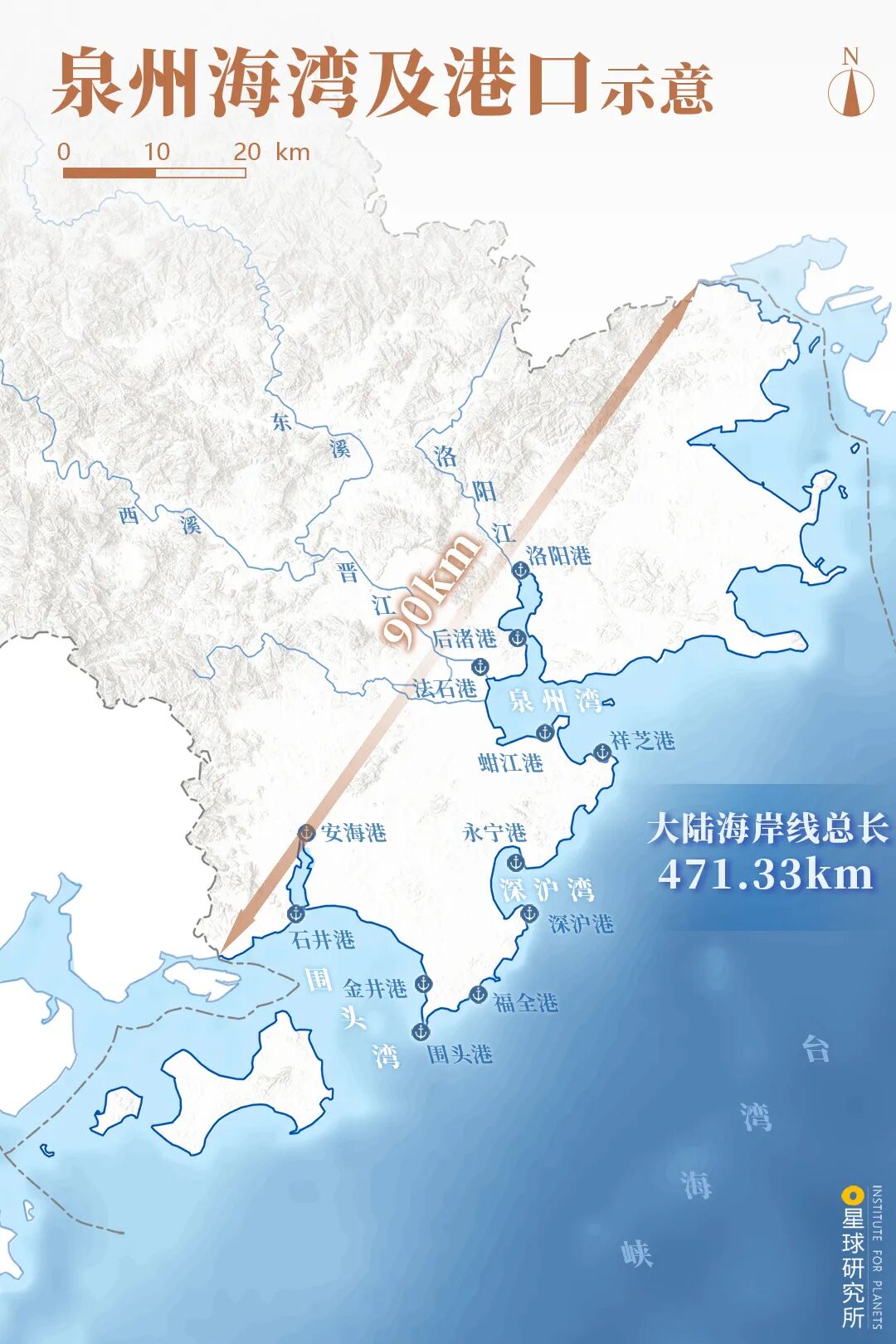 (泉州古称“刺桐”,图中展示的是广义范围下的刺桐港,包括晋江下游北起湄洲湾内澳,南至围头湾莲河一带的港湾,制图@陈志浩/星球研究所)