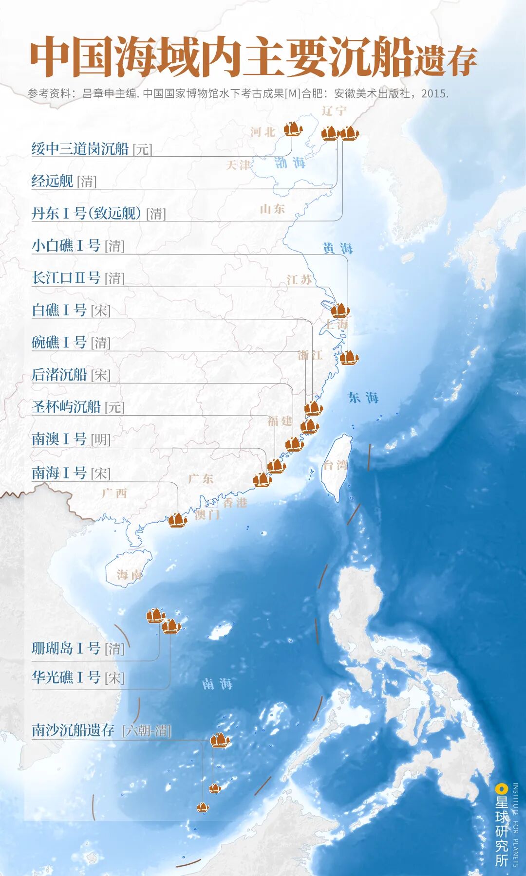 (中国海域内主要的沉船遗存分布,图内挑选了14处重要的沉船遗存点,截止至2016年,我国共发现了241处水下文化遗存(不含港澳台数据),其中沉船遗址115处,据估计,我国海域内的沉船至少有两千艘,制图@陈志浩/星球研究所)