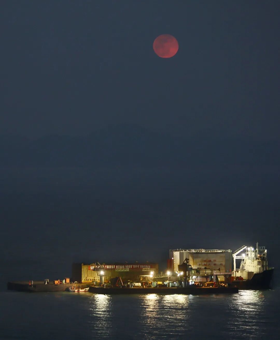 (2007年12月24日月满之时,承托着“南海I号”的驳船,停靠在了广东海陵岛上的临时码头,图片来源@视觉中国)