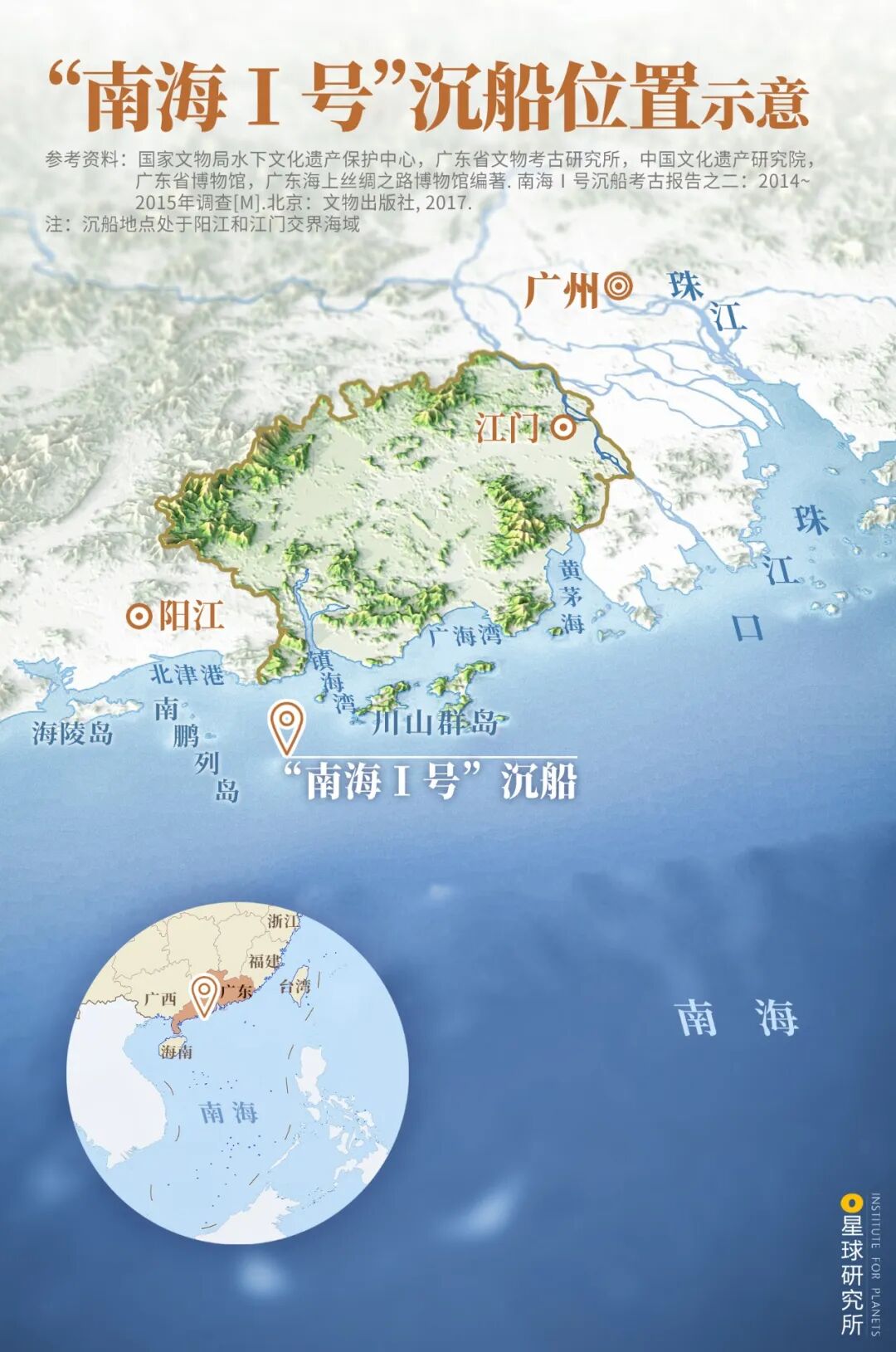 (“南海Ⅰ号”沉船位置处于阳江与江门的交界海域,制图@陈志浩/星球研究所)