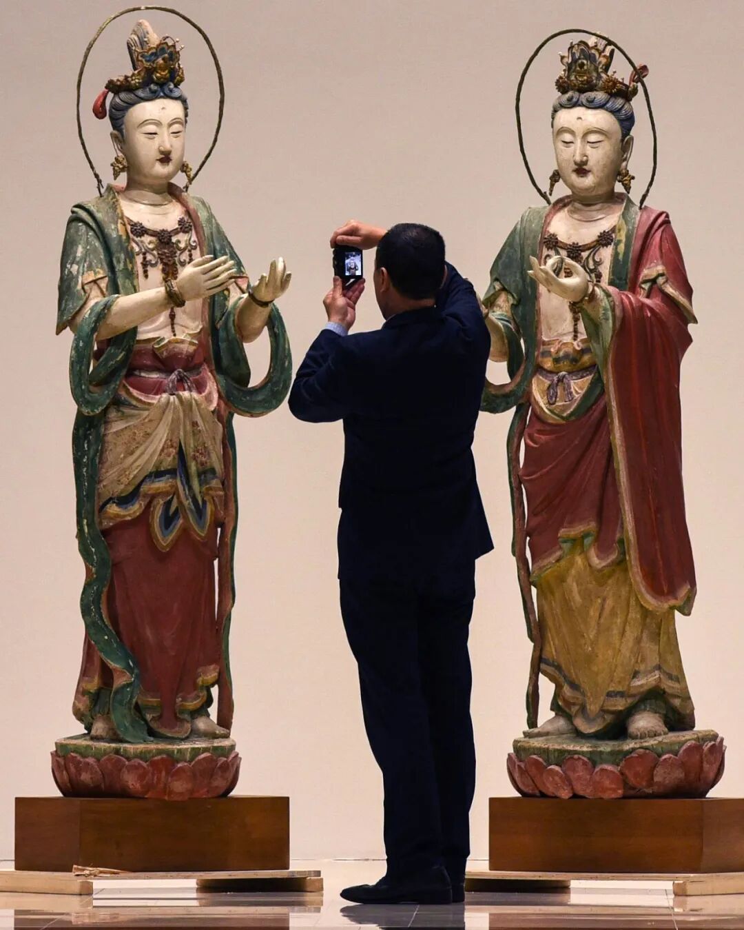 (23.9万件青花瓷被偷,在国外拍卖,中国人连举牌的机会都没有;下图是一名男子在佳士得精美瓷器和艺术品拍卖开始前欣赏一对来自13-14世纪的菩萨雕塑,图片来源@视觉中国)