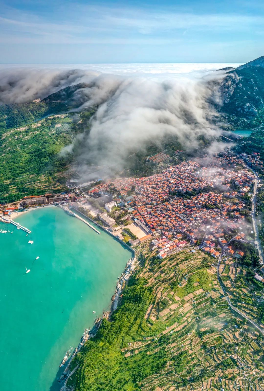 (崂山绿茶茶园,位于图中云瀑下方,图片来源@视觉中国)