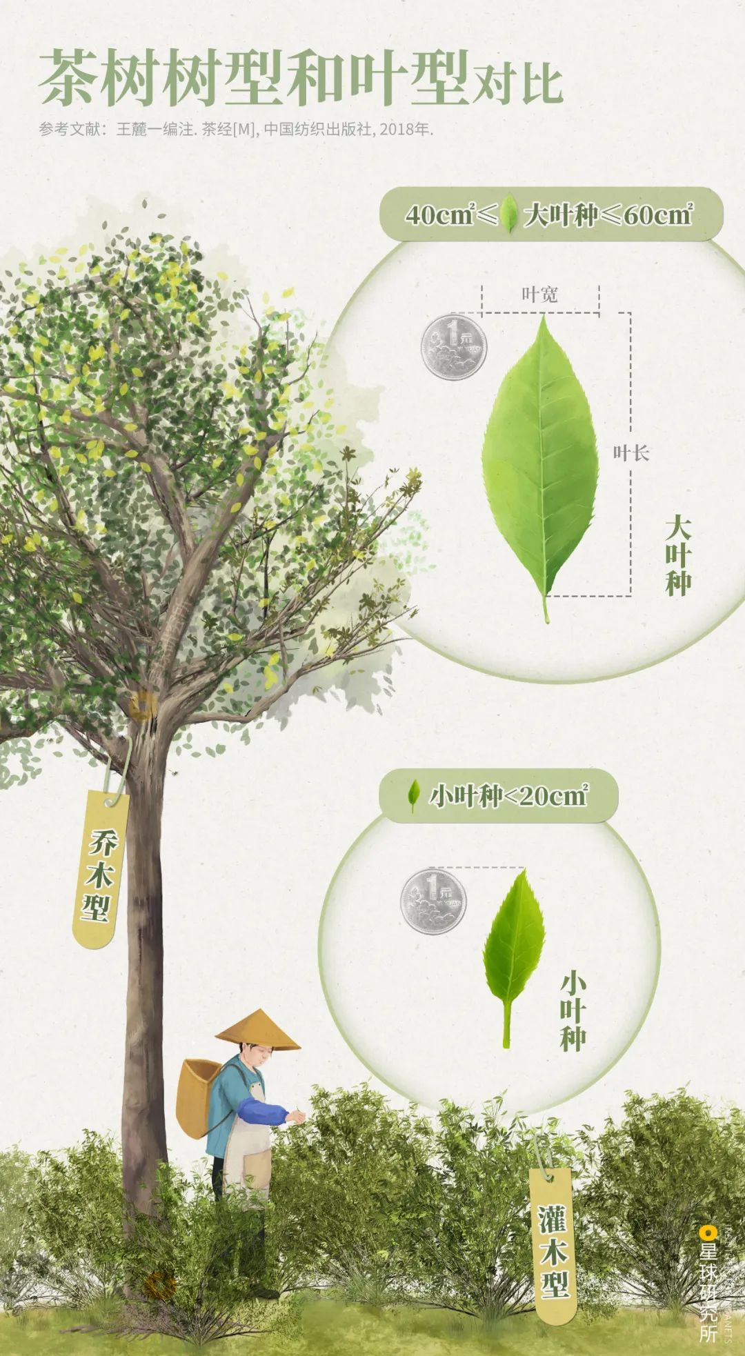 (茶树树型与叶种示意,由于篇幅所限,图中仅展示乔木型与灌木型、大叶种与小叶种的对比,制图@王天怡&王申雯/星球研究所)