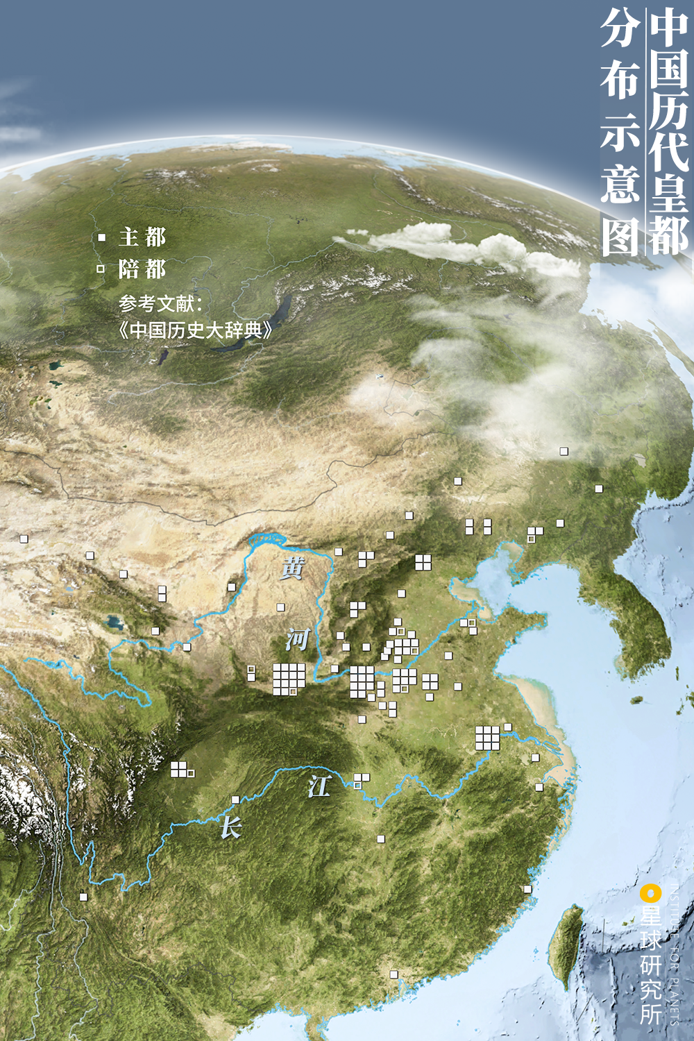 (上文数据,根据上海辞书出版社出版的《中国历史大辞典》附录一“中国历代世系表”整理而成,仅供参考;下图为中国历代皇都分布图,一个方块代表建都一次,制图@陈志浩&张靖/星球研究所)