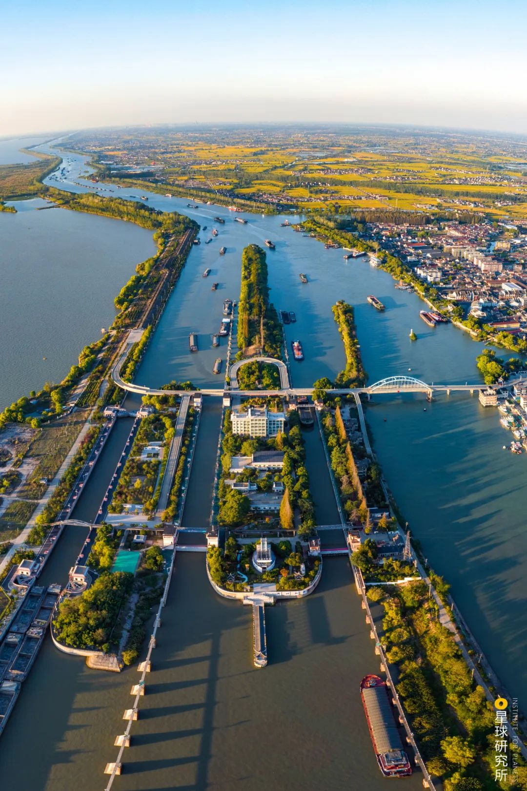 (请横屏观看,南水北调借用了京杭大运河部分段落;下图是扬州江都水利枢纽工程,摄影师@杨诚)