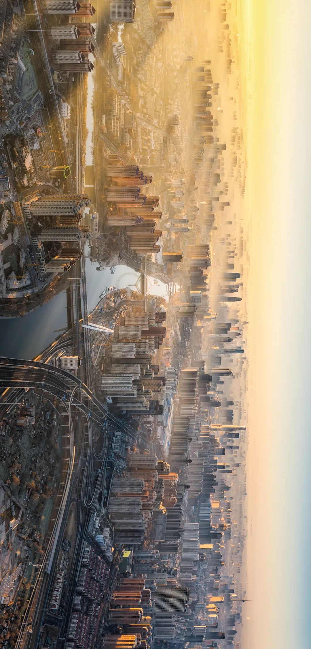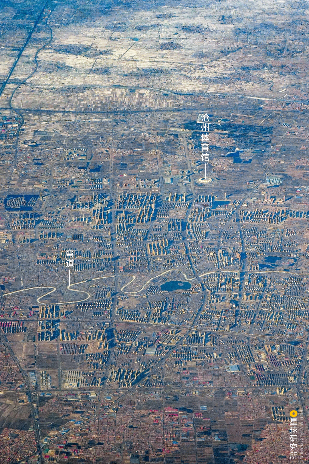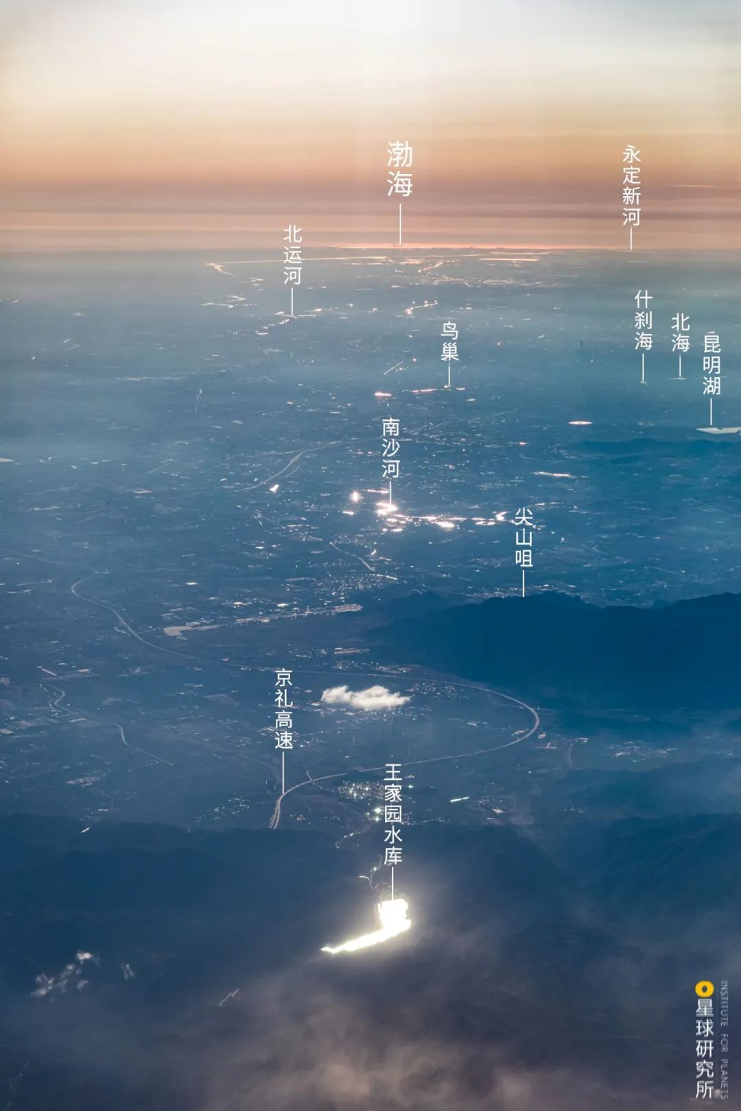 (由于当时金中都已被焚毁,元大都在金中都的东北方重新规划建设;下图是俯瞰北京周边地势,摄影师在河北怀来县上空,视野穿过北京、天津城区直达渤海海滨,直线距离超过200千米,摄影师@陈肖)