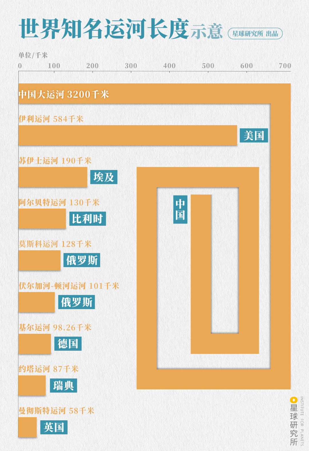 (世界知名运河长度对比,“中国大运河”是名副其实的“运河之王”,制图@馒头/星球研究所)