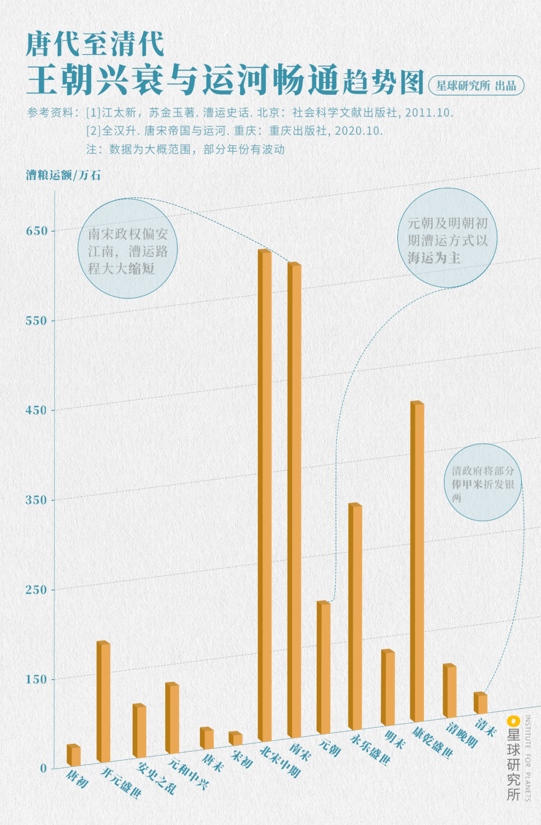(一些学者研究发现,大运河运输的漕粮数量,可以作为衡量王朝权力和稳定程度的尺度;下图是唐代至清代王朝兴衰与运河畅通趋势图,制图@馒头/星球研究所)