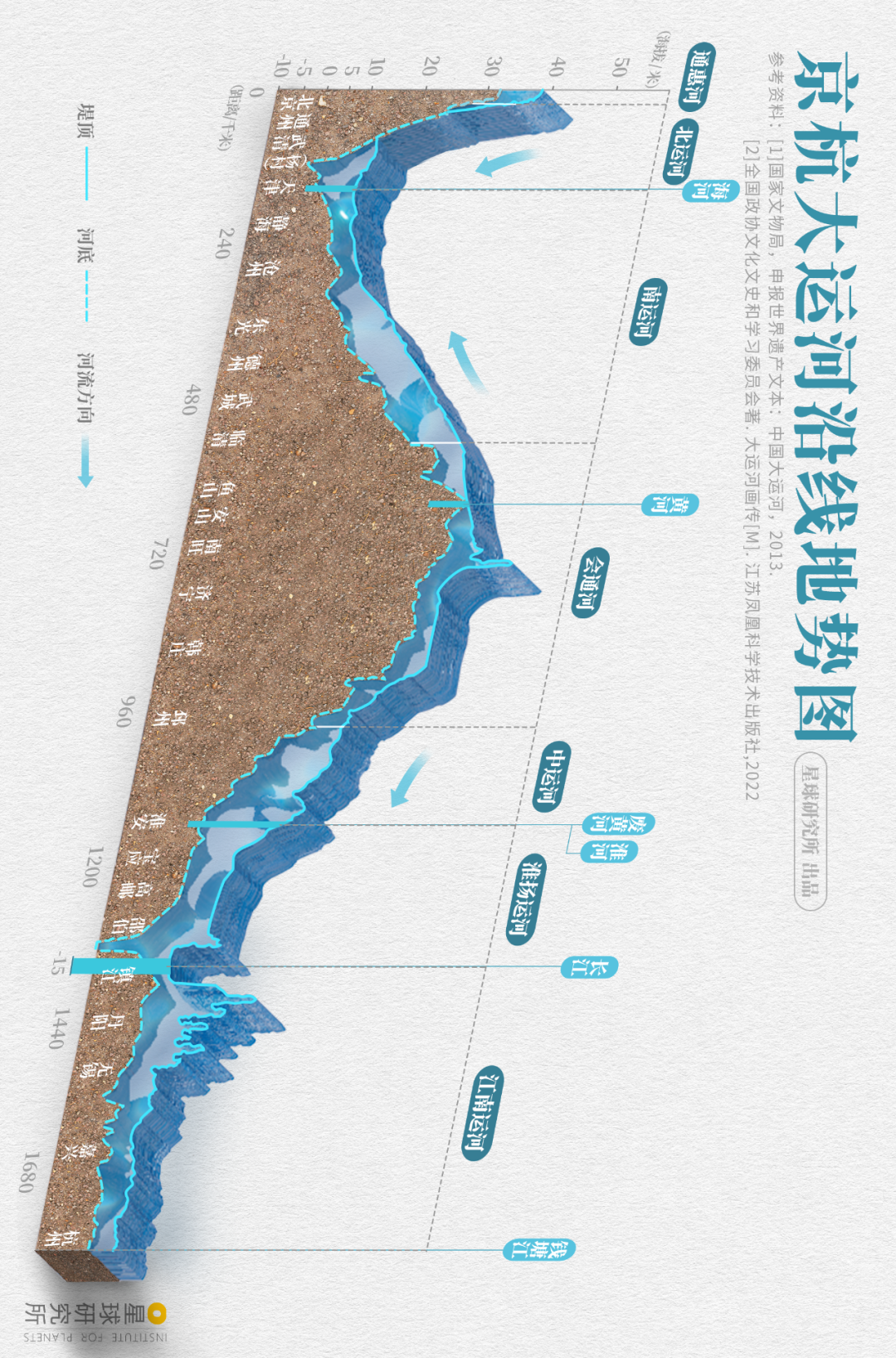(请横屏观看,京杭大运河沿线地势图,制图@馒头/星球研究所)