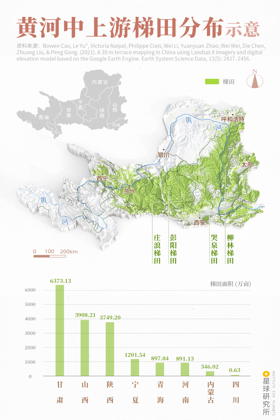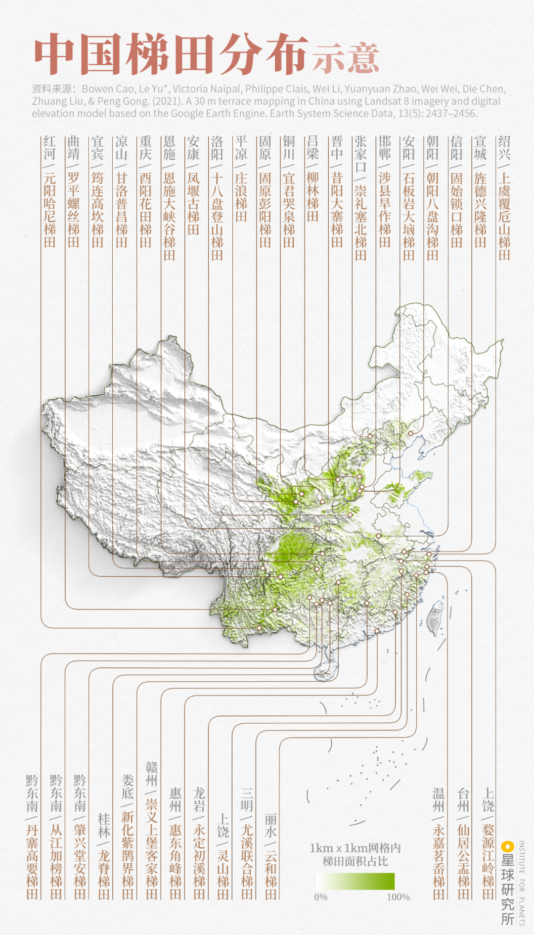 (不同口径下统计我国梯田面积数据存在差异,本文依据清华大学地球系统科学系俞乐课题组遥感测量数据,即8亿亩左右,下图为中国梯田分布示意,制图@郑艺/星球研究所)
