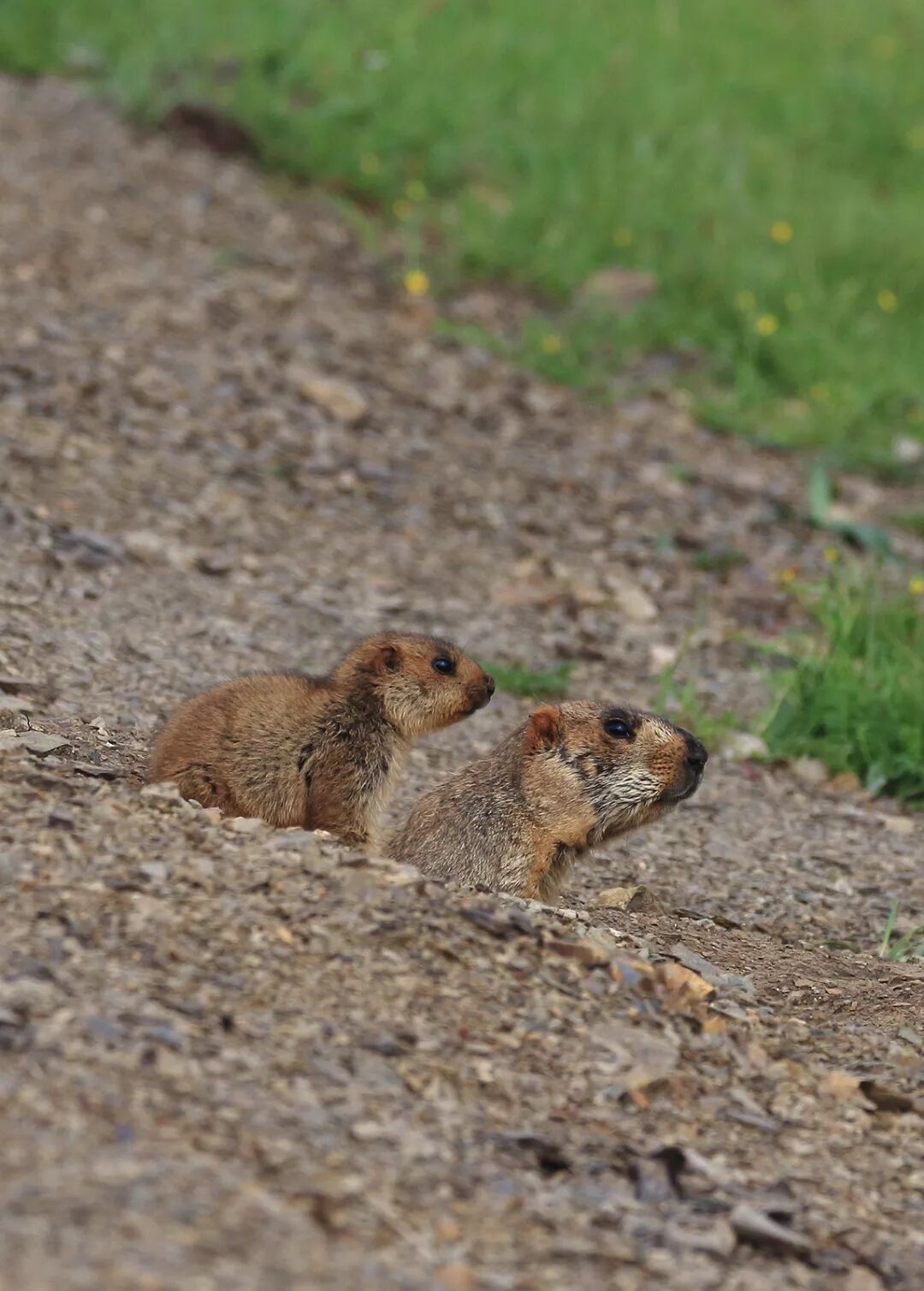 (猛禽离开后,旱獭妈妈小心翼翼地从洞中探出头,小旱獭已经急不可耐地钻出洞外,摄影师@邹滔)