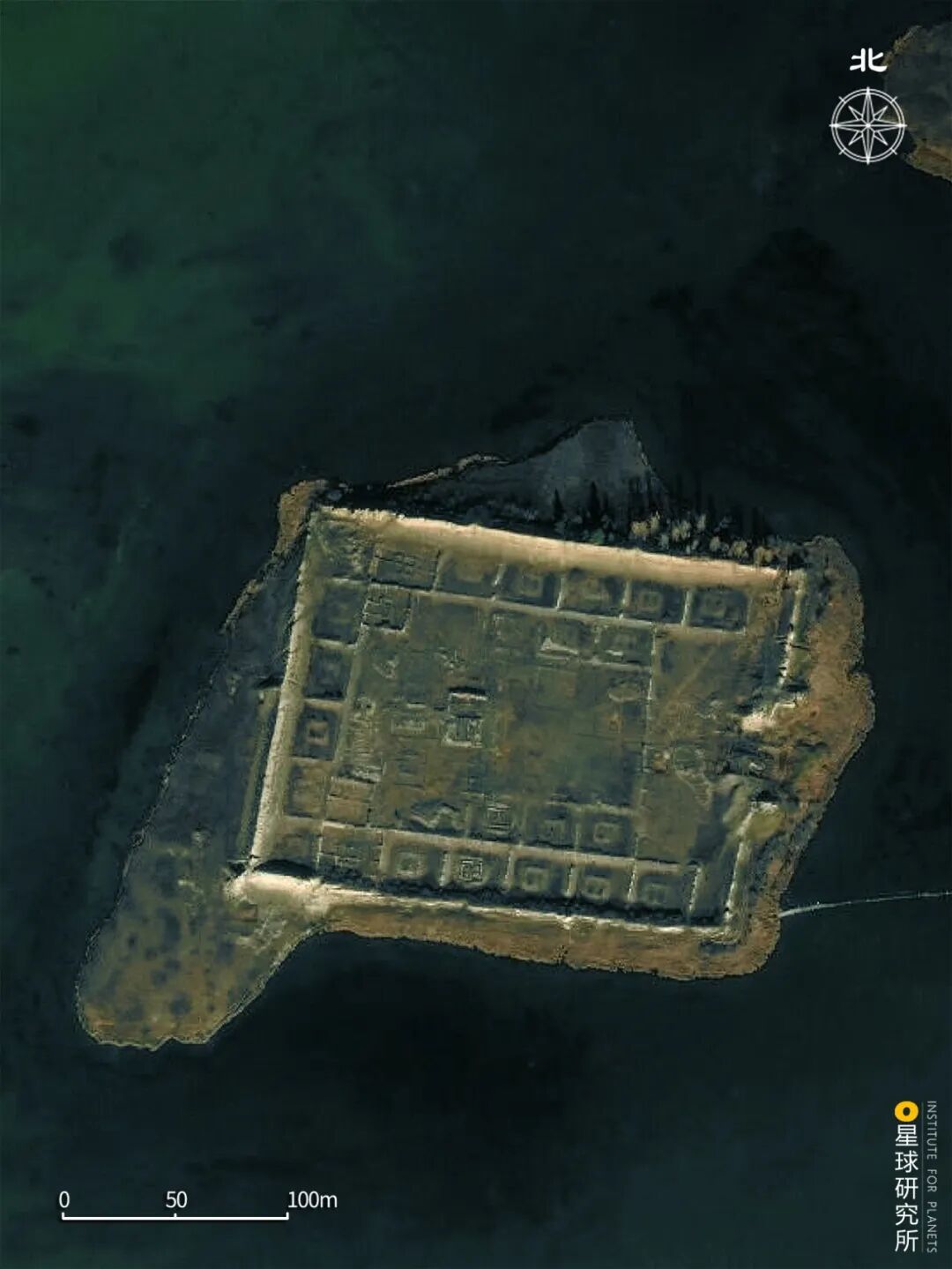 (浙江杭州良渚古城遗址卫星图,源自@Esri Image Map;距今约5000年,拥有9座城门,是已知史前最强大的城池;城池四角为圆形,东西南北四面却取直线,外围还有外廓城)