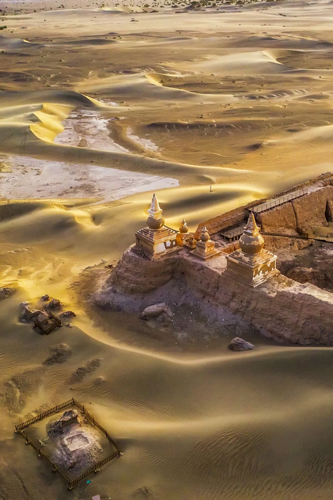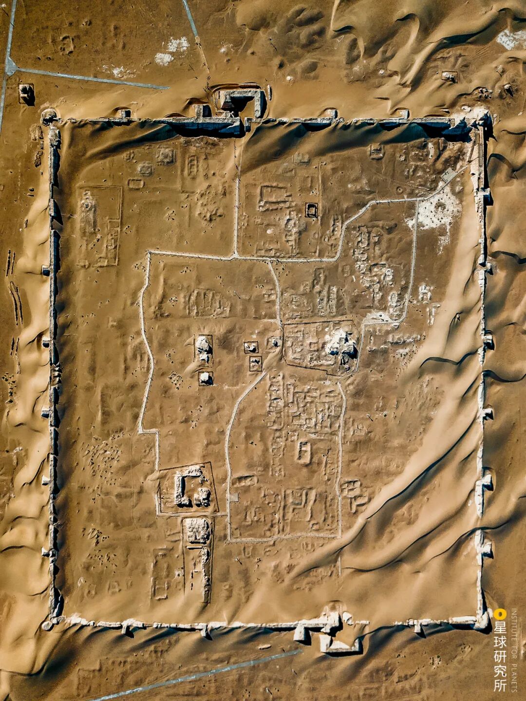 (航拍内蒙古额济纳旗黑水城遗址,可以看到流沙已经埋没部分城址;它并非全是西夏遗存,元代亦有增修,摄影师@卢文)