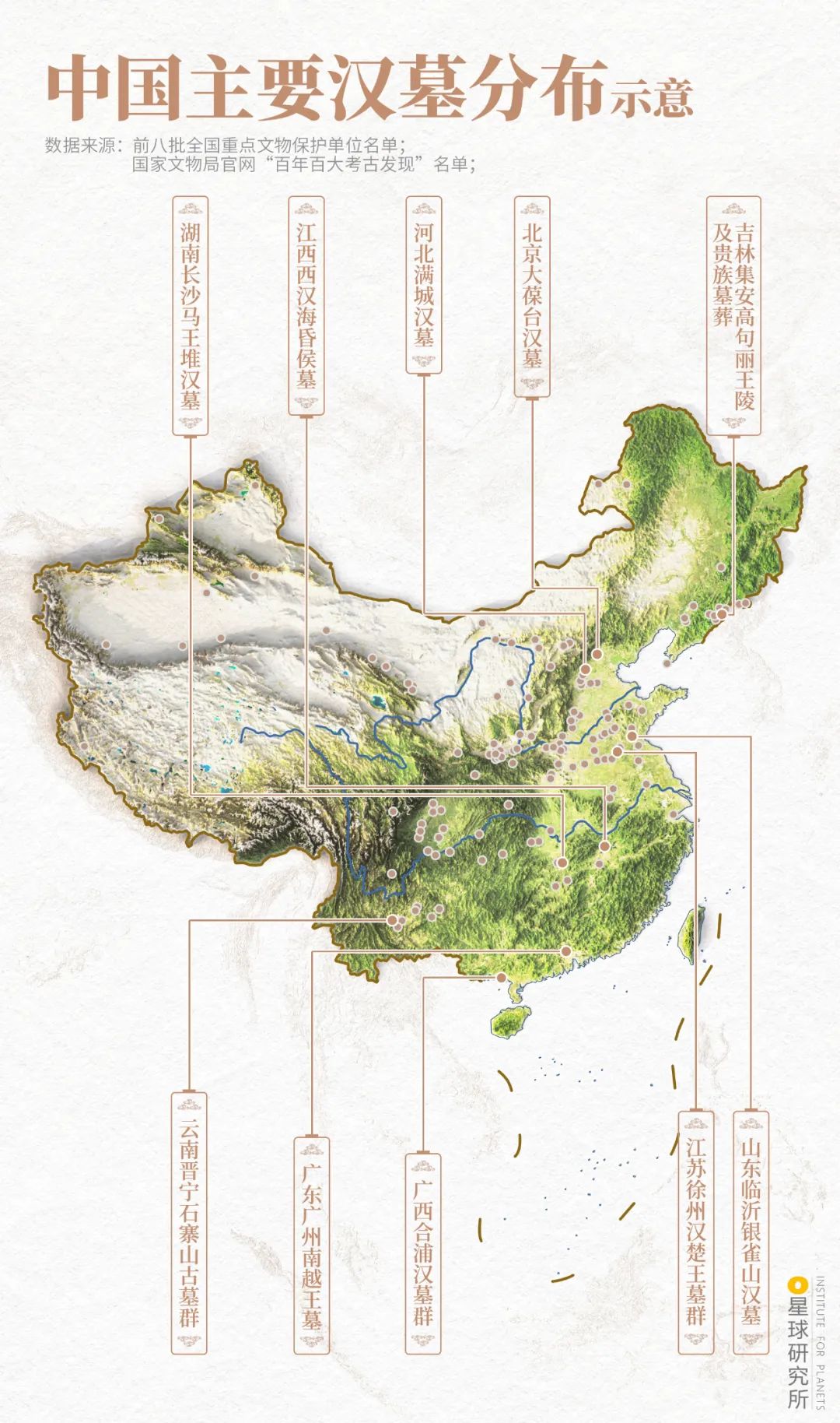 (上文中的“辛追”夫人可能为“避”夫人,学术界仍有争议,本文目前沿用“辛追”之名,后不再赘述,下图为中国主要汉墓分布示意,地图@陈志浩、汉青/星球研究所)