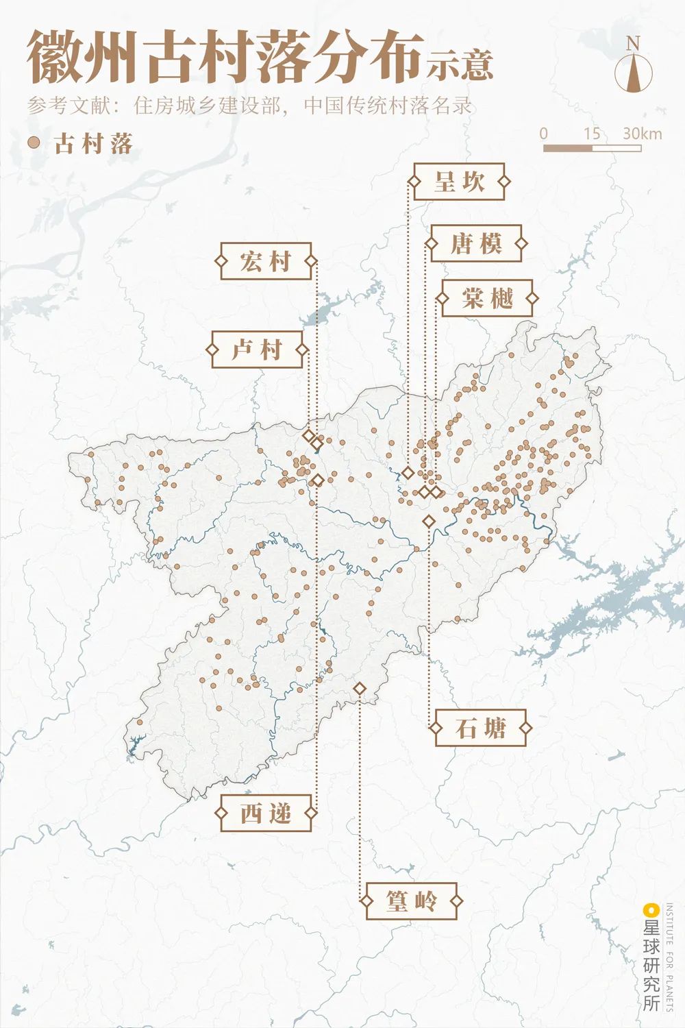 (部分古村落在徽州的分布示意图,制图@巩向杰&王申雯/星球研究所)
