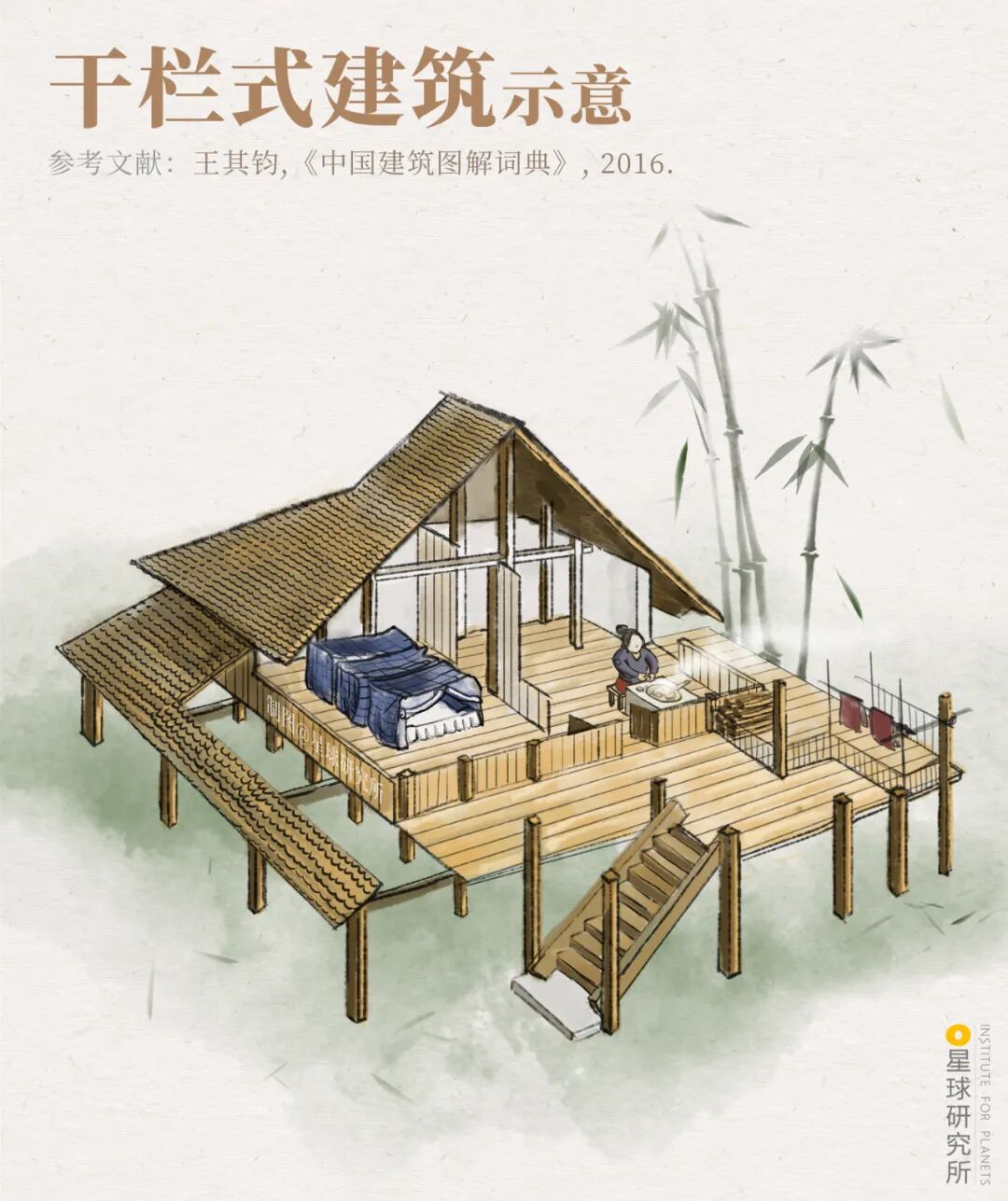 (干栏式建筑,其分布广泛,湘西吊脚楼、香港大澳棚屋都属于干栏式建筑,制图@王申雯/星球研究所)