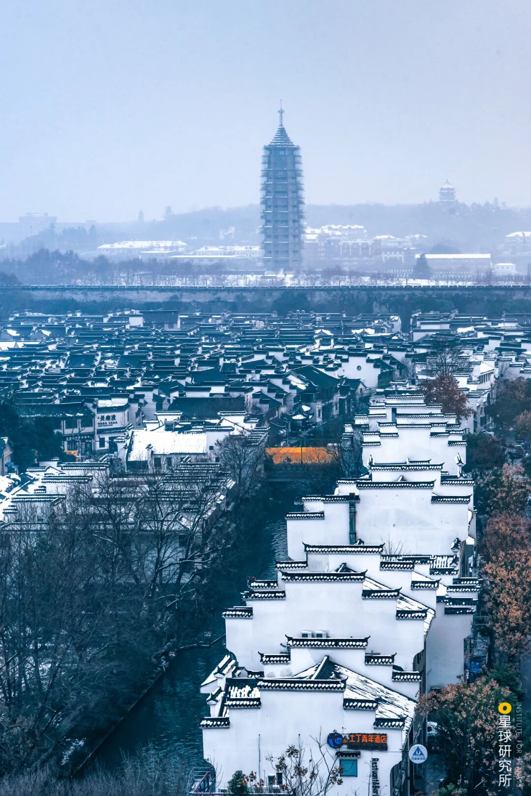 (南京老门东,这里大量运用徽州建筑元素,其中的骏惠书屋是从江西婺源迁建而来的徽宅,长身玉立的宝塔为大报恩寺遗址公园中复建的现代塔,摄影师@李毅恒)