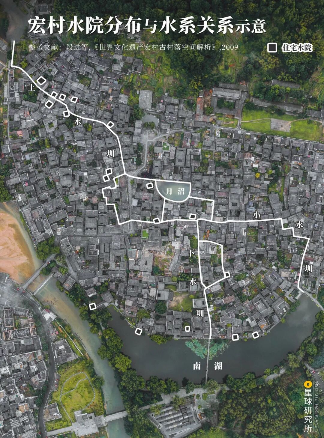 (宏村水院分布与水系的关系,摄影师@方建飞,制图@王申雯&巩向杰/星球研究所)